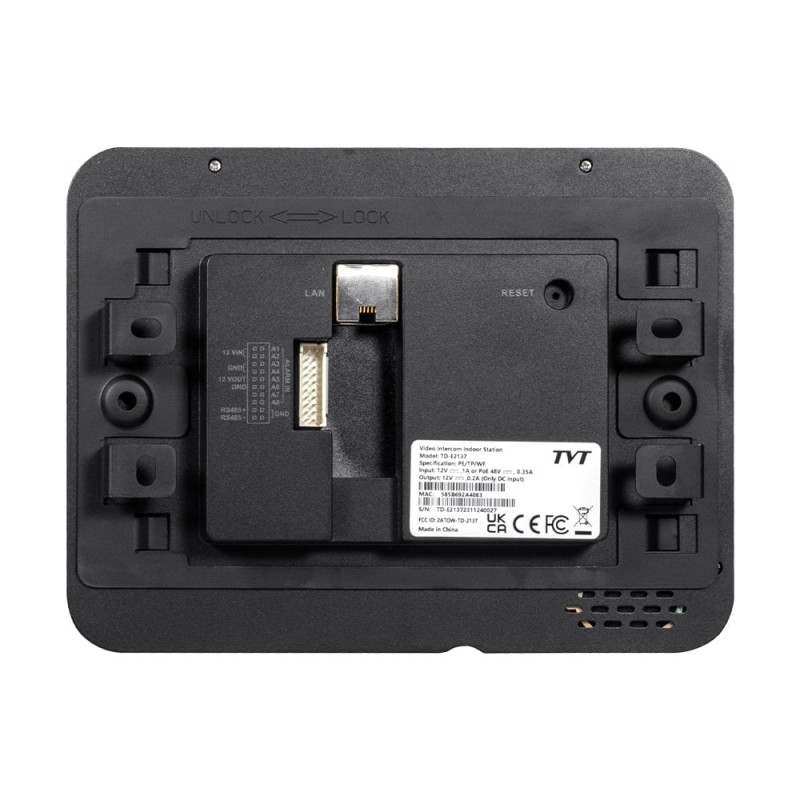 IP-відеодомофон з WiFi; 7-дюймовий сенсорний IPS-екран; підключення до 4 IP-камер максимальною роздільною здатністю 6Mp; 4 аудіовходи для IP-камер; роздільна здатність запису 2Mp; кількість пристроїв для одночасного перегляду 4; інтерком на 6 домофонів; карта пам'яті microSD до 256 ГБ; 8 тривожних входів; 2.4G WiFi; RJ45 100Mbps; живлення 12 В/PoE; розміри 180.6 / 135.6 / 26.8 мм; вага 0.36 кг