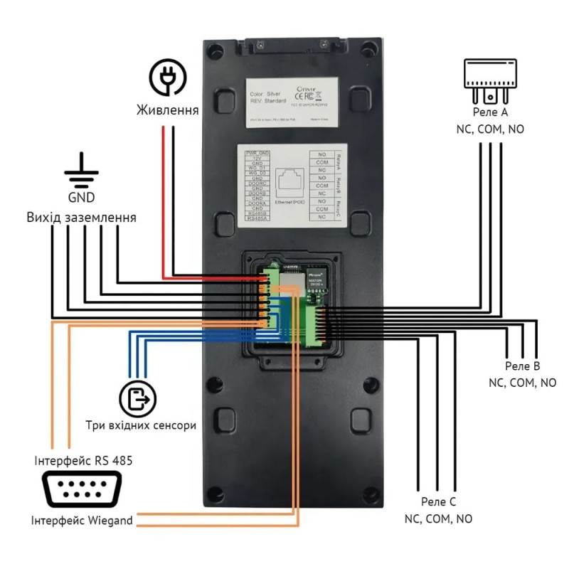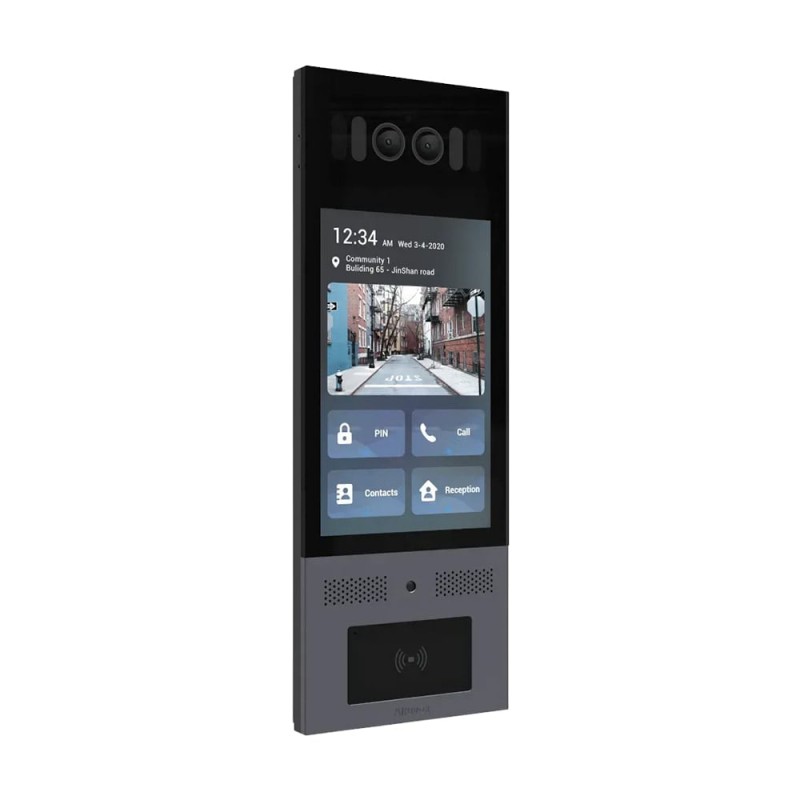 IP-відеопанель багатоабонентська з кольоровим IPS LCD-екраном 8", розпізнаванням облич та зчитувачем; підтримка багатофакторної ідентифікації: розпізнавання облич із точністю понад 99%, картка, PIN, QR-код і Bluetooth; камера 5 Мп із HDR, роздільна здатність 1920x1080, кути огляду 120° за горизонталлю / 67° за вертикаллю; RFID-зчитувач Mifare / EM-Marine / NFC; підтримка SIP, ONVIF; ІЧ/LED-підсвічування; аудіозв’язок із шумозаглушенням та компенсацією відлуння (аудіокодеки G.711a/μ, G.722); мережевий порт Ethernet RJ45 10/100M; інтерфейси: 3 релейні виходи, 3 входи, RS485, Wiegand; живлення PoE+ або 12-24 В; встановлення накладне або врізне; клас захисту IP65, IK10; робоча температура -30°C~+60°C; корпус антивандальний, нержавіюча сталь; розміри 350 / 130 / 41.6 мм