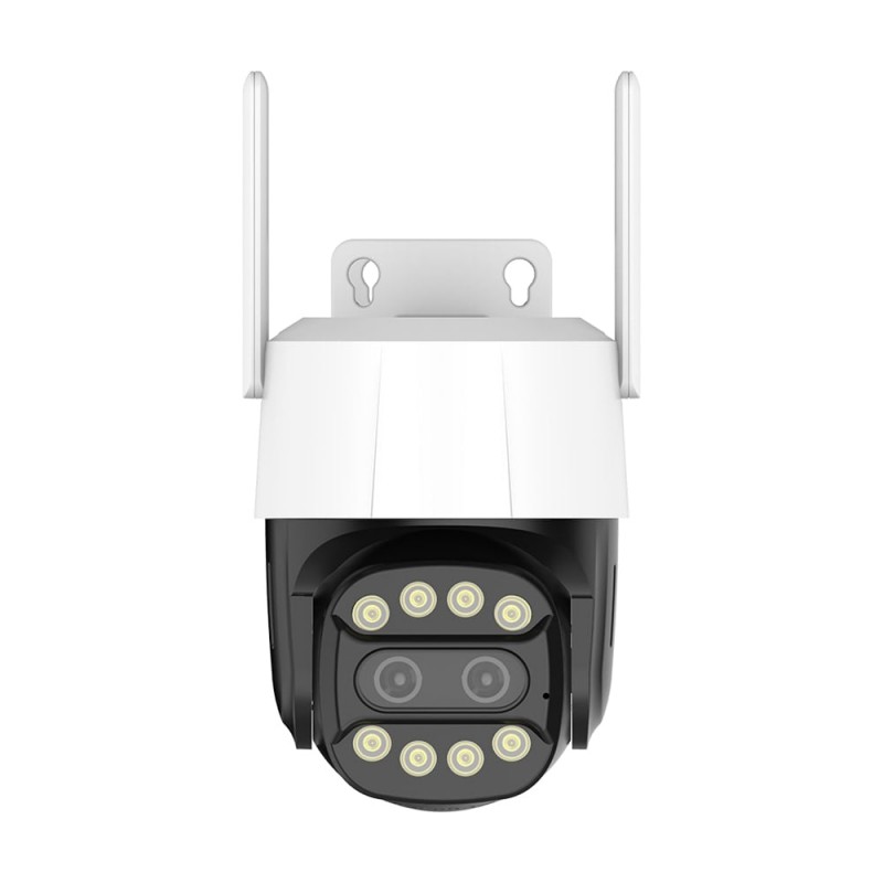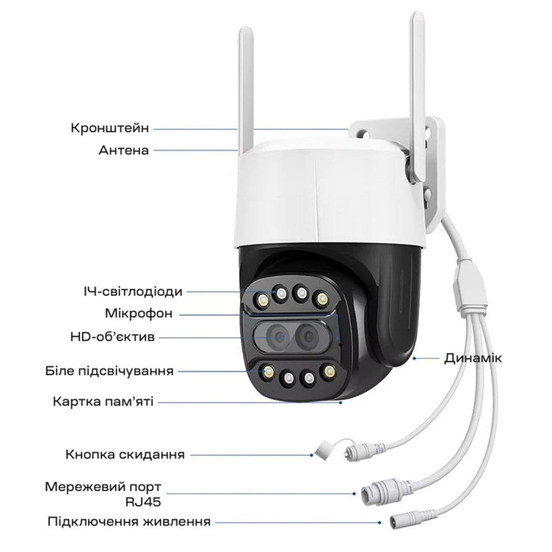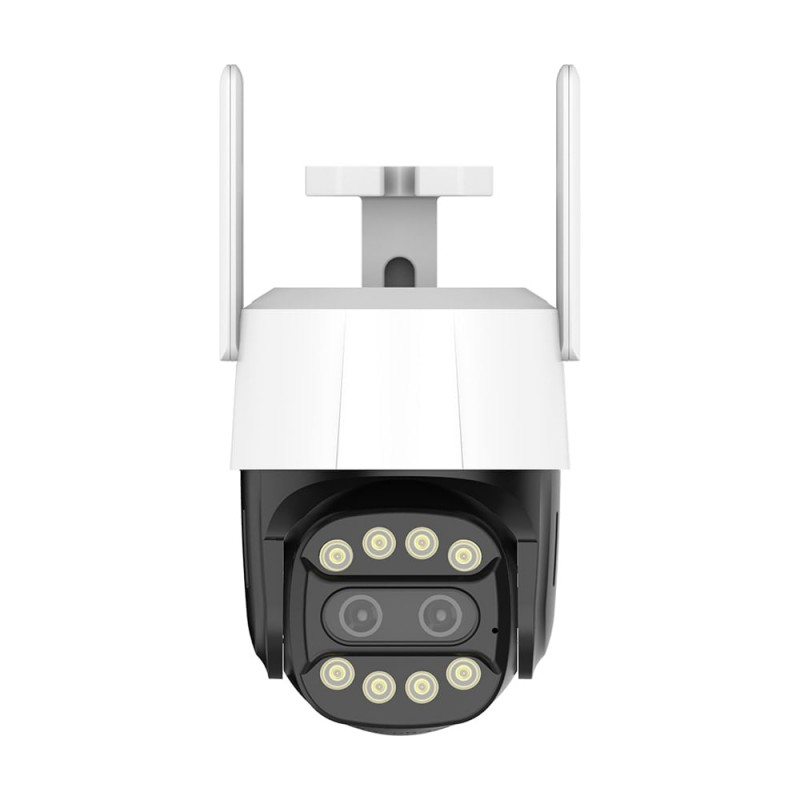8Mp+8Mp вулична поворотна IP-відеокамера з підтримкою Wi-Fi (2.4 ГГц і 5.8 ГГц), з подвійним об’єктивом і подвійним підсвічуванням; об’єктив 3.6 мм + 8 мм; роздільна здатність запису 3840*2160 x2; кут повороту 0-355°, кут нахилу 0-90°; ІЧ-підсвічування до 30 м + LED-підсвічування до 30 м; віддалений моніторинг на смартфонах (застосунок CamHipro); детекція руху, виявлення людини, автотрекінг; вбудований мікрофон та розмовний динамік; запис за детекцією на карту microSD (до 128 ГБ); живлення 12 В/1 А; робоча температура -10°C~+55°C; клас захисту IP66; габаритні розміри 145 / 140 мм, антени 96 мм, кріплення 62 / 70 мм