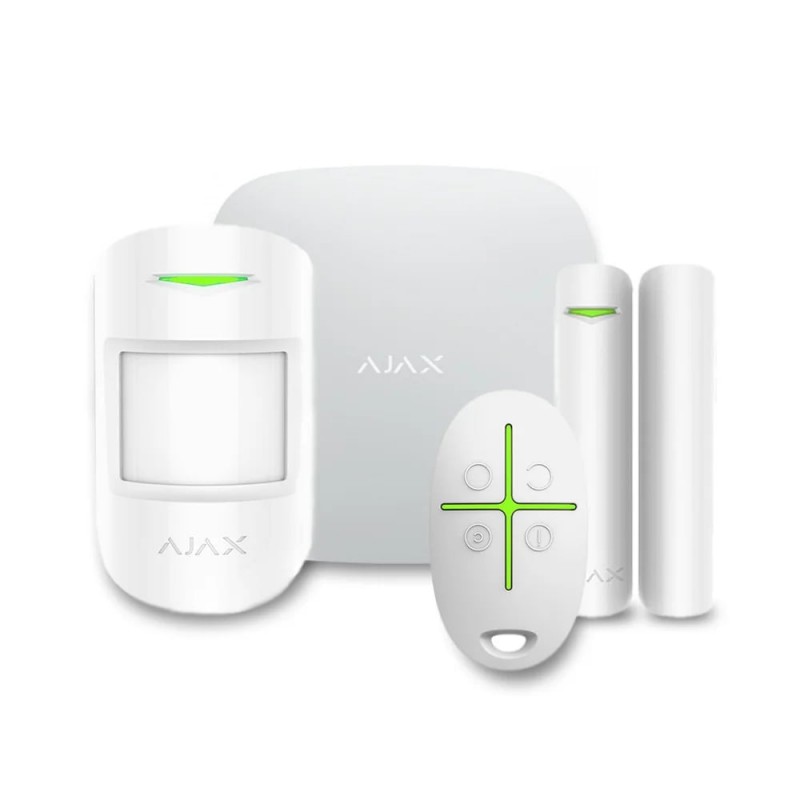 Комплект бездротової сигналізації з 4 пристроїв: розумна централь Ajax Hub біла, бездротовий датчик відчинення дверей/вікон Ajax DoorProtect білий, бездротовий датчик руху Ajax MotionProtect білий, брелок для керування охоронною системою Ajax SpaceControl білий; канали зв'язку GSM (2G), Ethernet; протокол Jeweller; підключення до 100 пристроїв, до 10 камер/відеореєстраторів, 50 користувачів.