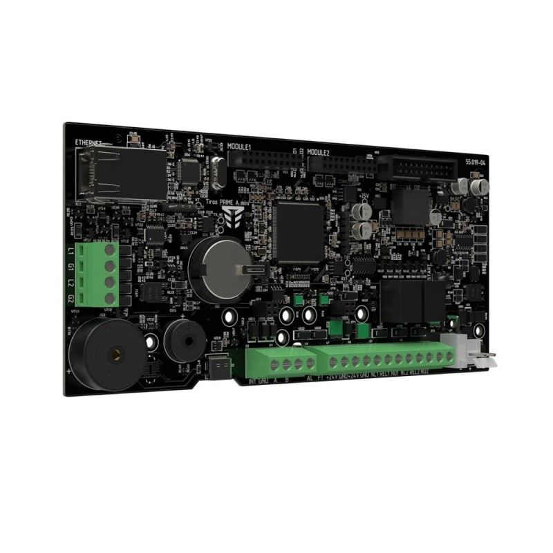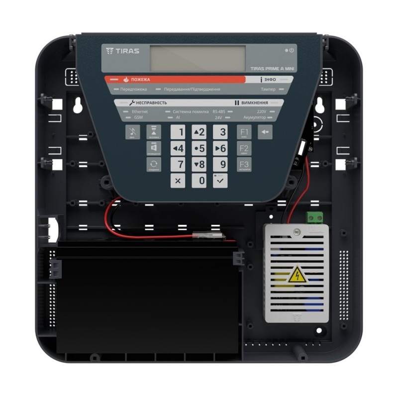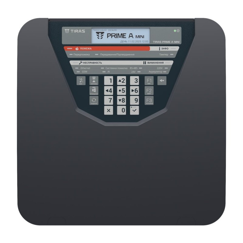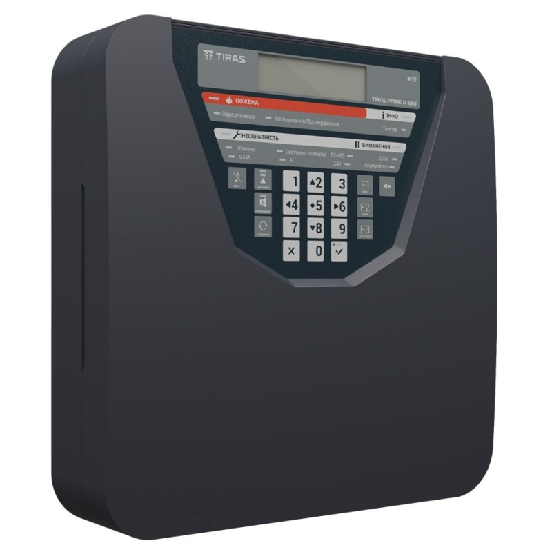 Прилад приймально-контрольний пожежний адресний; 1 адресний інтерфейс, 250 адресних пристроїв, 1 вхід/4 виходи для керування автоматикою; можливість максимального розширення до 2 адресних інтерфейсів, до 128 входів/виходів для керування автоматикою; адресний інтерфейс: підключення до 250 адресних пристроїв у кільцевій топології, до 32 в радіальній, довжина лінії до 2000 м, час реакції 0.4 с, максимальний опір 125 Ом; живлення: основне 220 В, вбудований блок живлення 35 Вт, резервне акумулятори LiFePO4 або свинцево-кислотні ємністю 7-8 А·год; зв’язок Ethernet, а також 4G/2G/Wi-Fi через комунікатори M-LTE, M-2G, M-WiFi (купуються окремо); інтерфейси RS485 для підключення до 16 неадресних модулів контролю автоматики та ПУіЗ TIRAS 1X та USB Type-C; розміри 280 / 280 / 80 мм, вага 1.25 кг