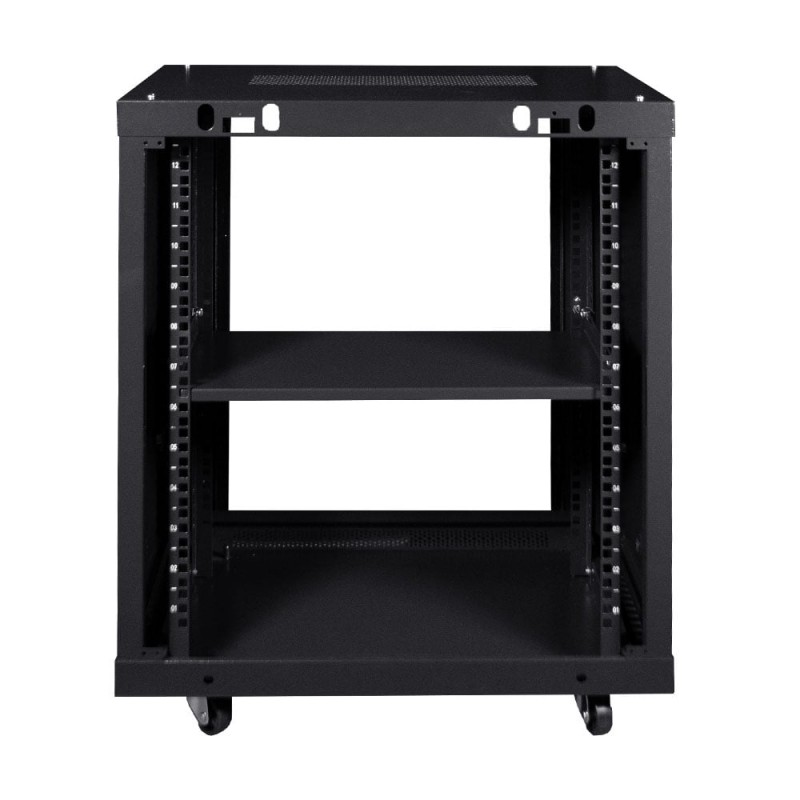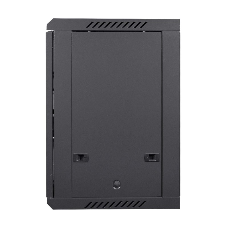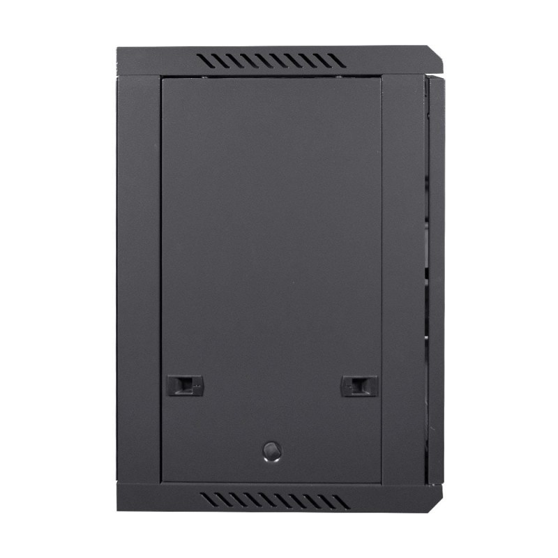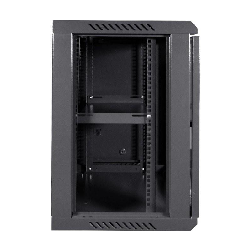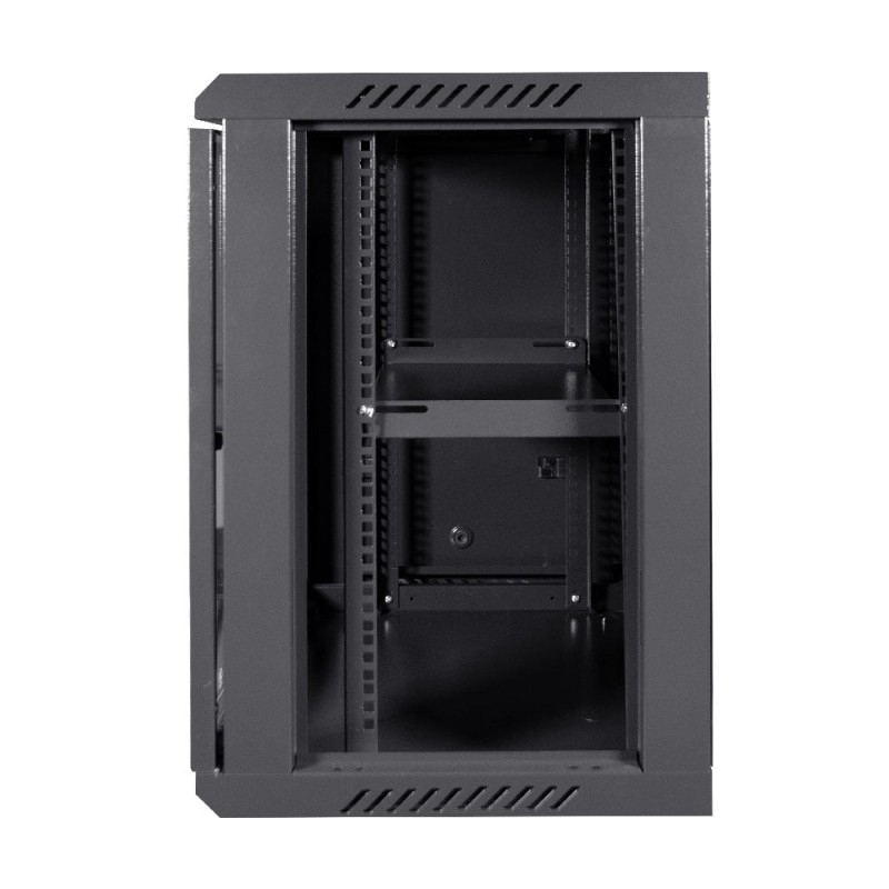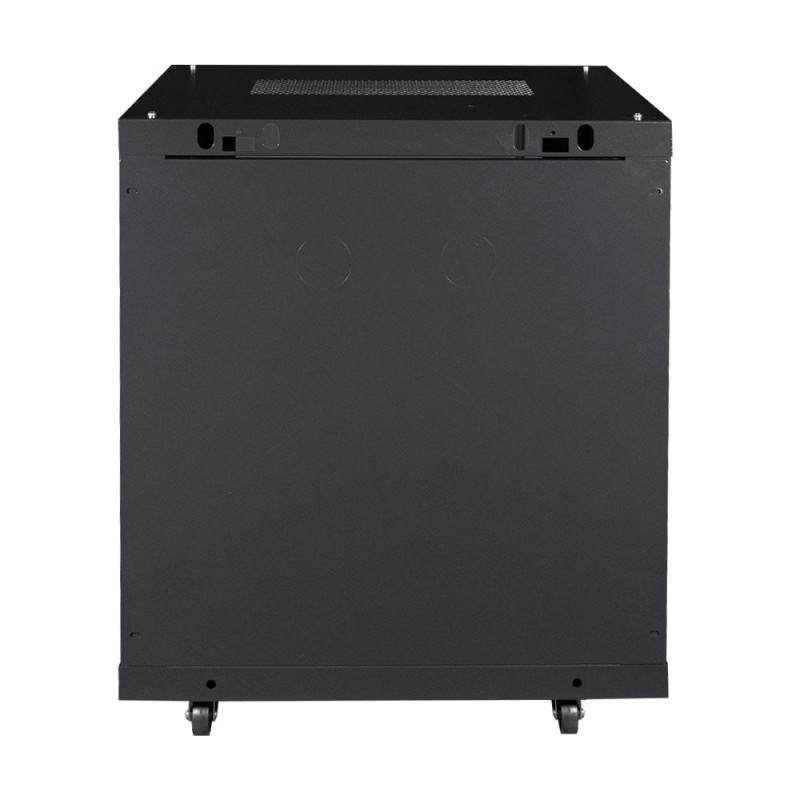 Комутаційна шафа з габаритними розмірами: ширина 600 мм, глибина 450 мм, висота 12U – 640 мм; максимальне навантаження 100 кг; матеріал корпусу: сталь, пофарбована порошковою фарбою чорного кольору RAL9005; дверцята із загартованого скла, зачиняються на замок (2 ключі у комплекті); кабельні введення у верхній, нижній та задній панелях; у комплекті коліщатка для зручного переміщення; ступінь захисту IP20; постачання – у розібраному вигляді