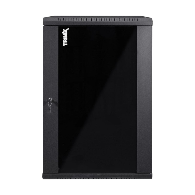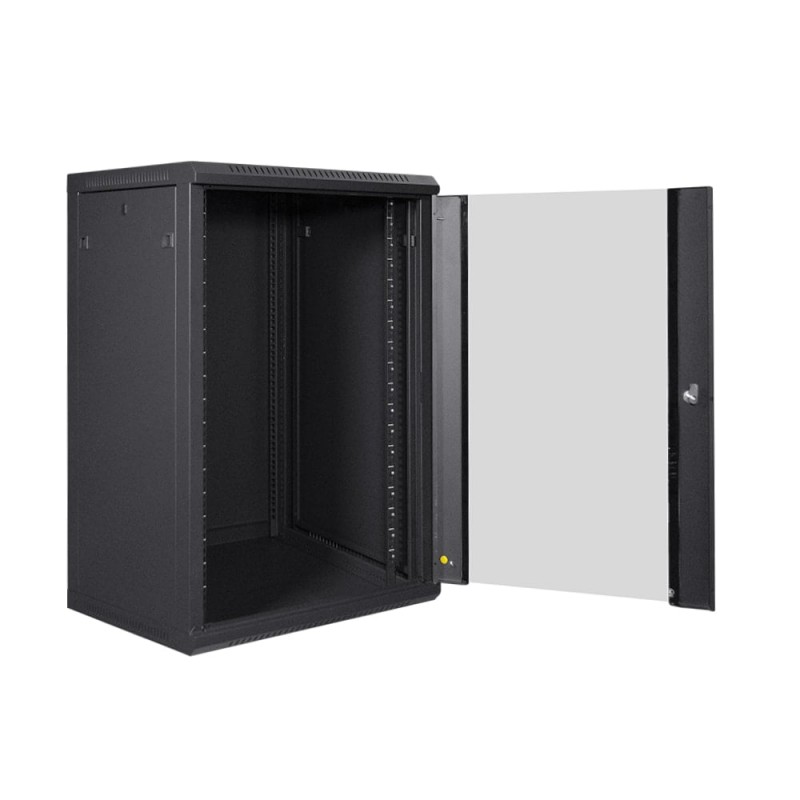 Комутаційна шафа, розбірна, з дверцятами; максимальне статичне навантаження 55 кг; шафа зачиняється на замок, ключі у комплекті; товщина: вертикальні монтажні рейки – 1.7 мм, монтажна балка – 1 мм, бічна панель – 0.8 мм, рама – 0.8 мм; габаритні розміри: ширина 600 мм, глибина 600 мм, висота 18U – 903 мм; клас захисту захисту IP20; колір чорний