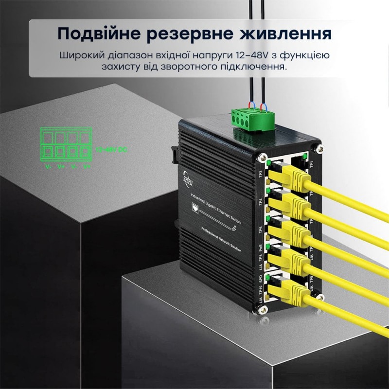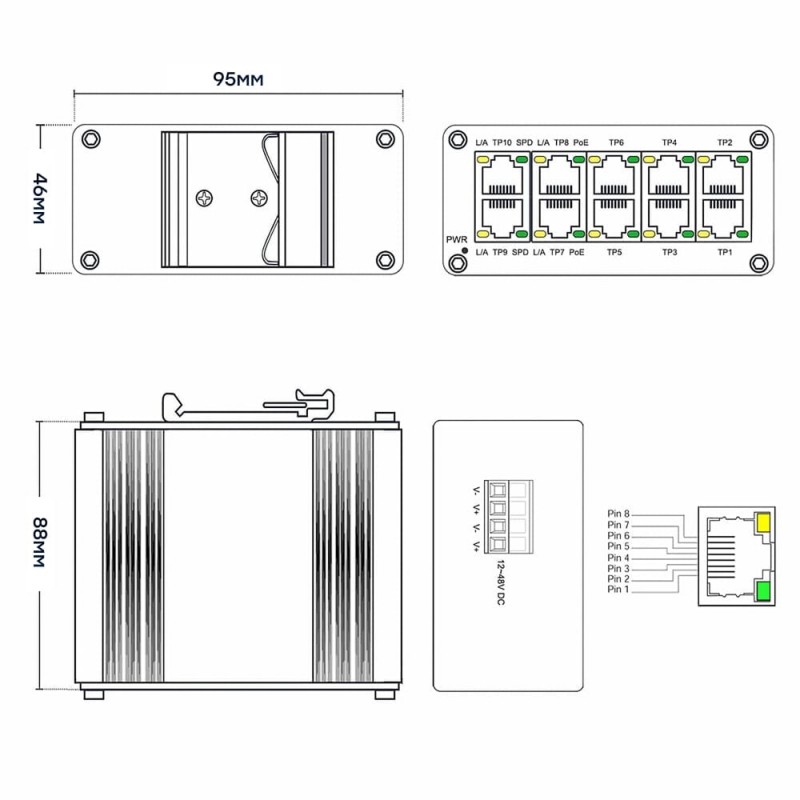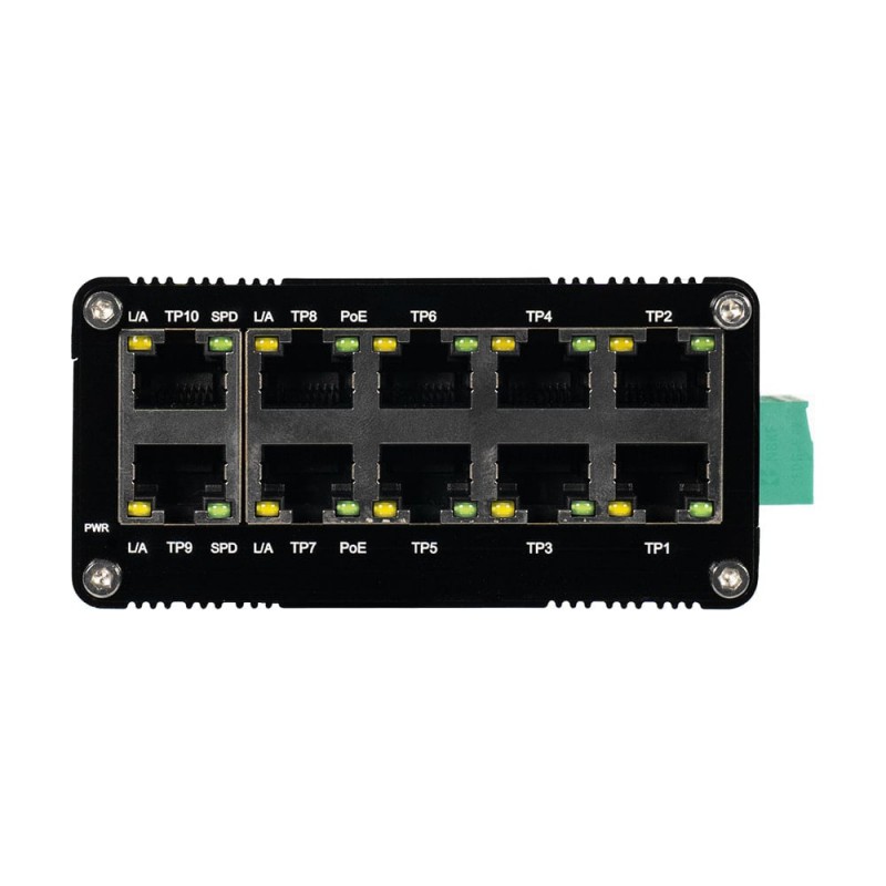 10-портовий промисловий некерований РоE-комутатор з 8-портами PoE 10/100/1000BASE-T 802.3at, 2 портами 10/100/1000T RJ45 Uplink; стандарт живлення РоЕ: IEEE802.3at/af, PoE Pin: 4,5 + / 7,8-; загальна потужність PoE: 240 Вт за живлення 48 В, 120 Вт за живлення 24 В, 60 Вт за живлення 12 В; живлення DC 12-48 В; монтаж на DIN-рейку; клас захисту IP40; захист від перенапруги 8kV; робоча температура від -40 до +80 °C; розмір 95 / 88 / 46 мм; вага 400 г