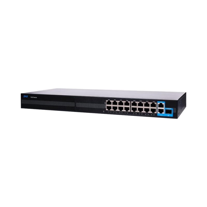 19-портовий PoE-комутатор з 16 портами PoE 10/100Mbps, 2 портами Uplink 10/100/1000Mbps і 1 SFP-портом 1000Mbps; пропускна здатність: 9.2 Гб/с; стандарт живлення PoE: IEEE802.3at/af, PoE Pin: 1,2 + / 3,6-; максимальна відстань живлення PoE: до 100 м (100 Мбіт/канал), до 250 м (10 Mбіт/канал); порти 1-16 – підтримка режиму дальньої дії до 250 м і функції Watchdog; загальна потужність: 250 Вт (до 30 Вт на порт); таблиця MAC-адрес 8K; живлення 100~240V/AC; блискавкозахист: 6KV, захист від електростатичного розряду: 8KV; робоча температура від -20 до +60 °C; кріплення в комплекті; розміри: 440 / 180 / 45 мм; вага: 2.8 кг