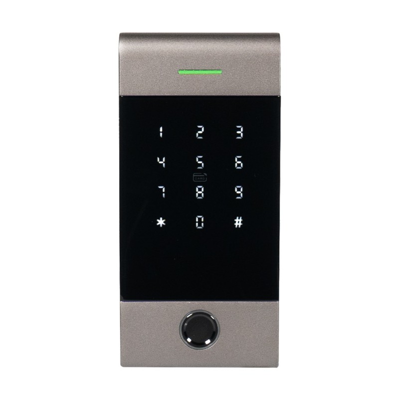 Автономна сенсорна клавіатура/контролер зі скануванням відбитку пальця та вбудованим зчитувачем карток і брелоків Mifare (13.56 МГц); вбудований Bluetooth, працює через мобільний застосуноки TTHotel та TTLock; контроль доступу: за відбитком пальця, кодом, картою, через мобільний застосунок; живлення DC 12 В; матеріал алюмінієвий сплав; ступінь захисту IP65; розміри 158 / 74 / 17 мм