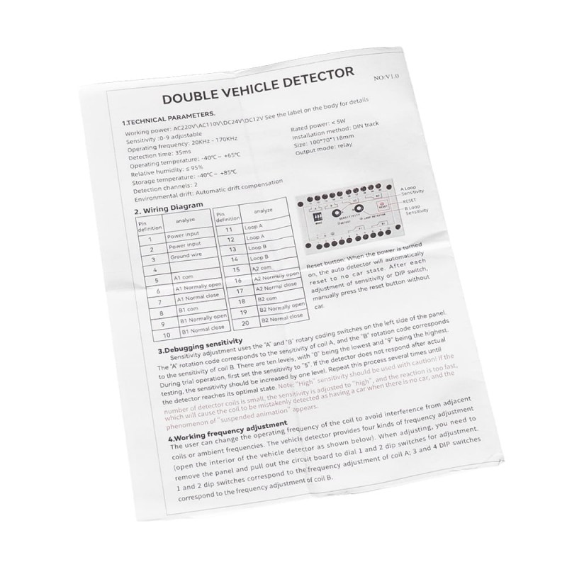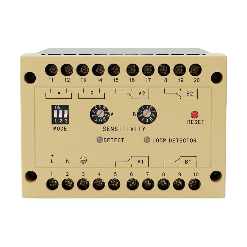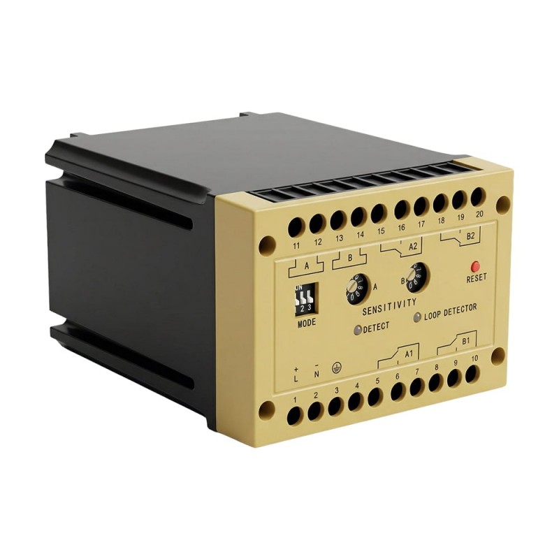 Двоканальний контролер індукційної петлі; індуктивність шлейфа 80-1000 мкГн; 4 релейні виходи (2 на канал); 10-рівневе налаштування чутливості; час відгуку 35 мс; розпізнавання напрямку руху, функція затримки 0-4.5 с, функція постійної присутності, самодіагностика; робоча напруга AC 220 В; встановлення на DIN-рейку; діапазон робочих температур -40°С…+65°С; пластиковий корпус; габаритні розміри 100 / 118 / 70 мм