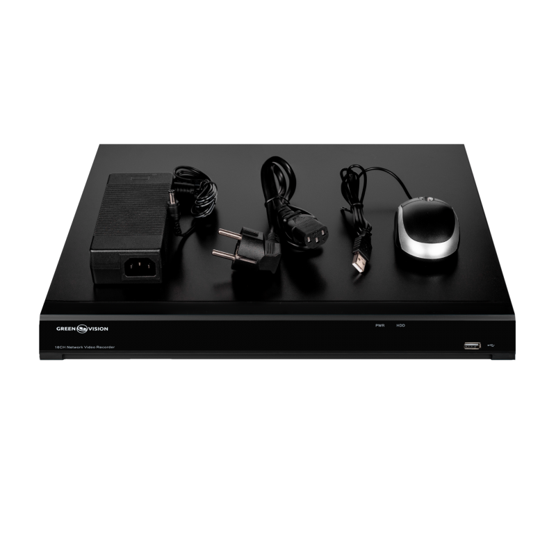 Сетевой видеорегистратор ([Тип]) для [Технология передачи видео] камер GreenVision [Артикул] позволяет одновременно записывать и воспроизводить видеопотоки одновременно с [Количество каналов IP] [Технология передачи видео] камер в разрешении ([Разрешение]).