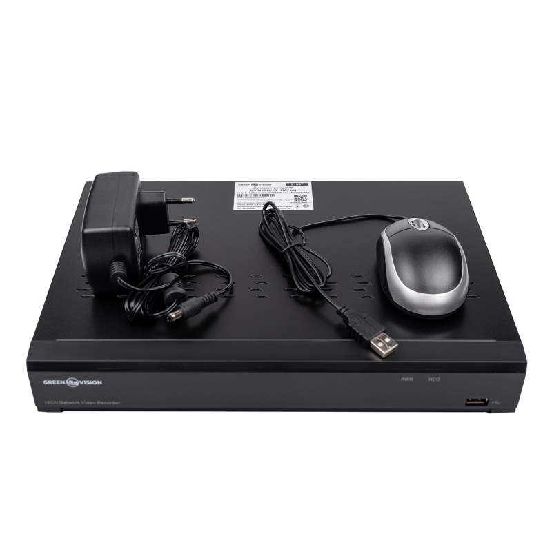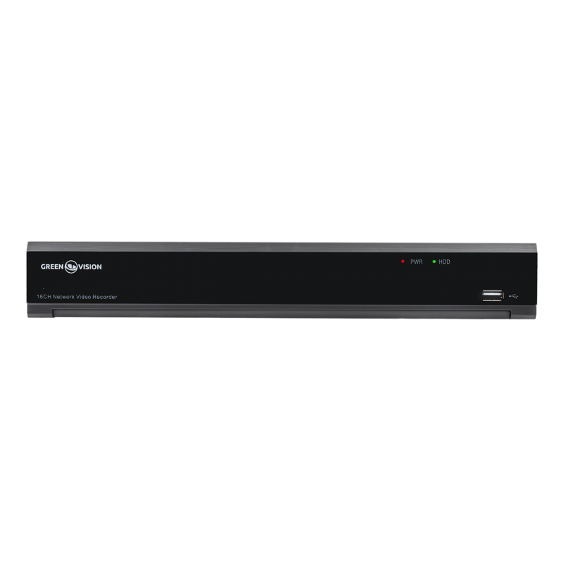Сетевой видеорегистратор ([Тип]) для [Технология передачи видео] камер GreenVision [Артикул] позволяет одновременно записывать и воспроизводить видеопотоки одновременно с [Количество каналов IP] [Технология передачи видео] камер в разрешении ([Разрешение]).