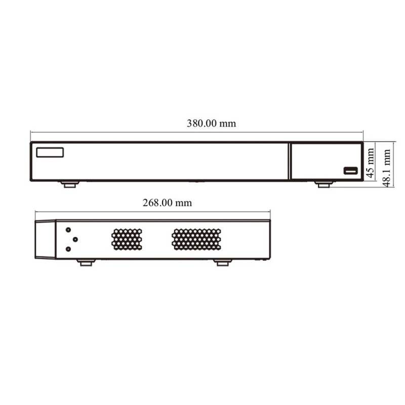 16-канальний мережевий відеореєстратор з підтримкою інтелектуальної відеоаналітики, з максимальною роздільною здатністю 16MP; відеокодек H.265+, H.265S, H.265, H.264; запис: 16MP / 12MP / 8MP / 6MP / 5MP / 4MP / 3MP / 1080P / 960P / 720P @ 25fps; вхідний/вихідний потоки 192Mbps/192Mbps; відеовихід: HDMI (4K), VGA (Full HD); аудіо: вхід RCA x1 / вихід RCA x1; тривожні: входи 8/виходи 4; база даних облич: 32 бібліотеки/10000 фото облич, порівняння облич: 18 зображень/сек; перегляд архіву камер: локально/мережею 16/16; мережа: RJ45 1000Mbps x2, USB 2.0 x2, USB 3.0 x1, HDD: SATA x2 до 10 ТБ; живлення DC 12V/4А; розміри 380 / 268 / 48.1 мм