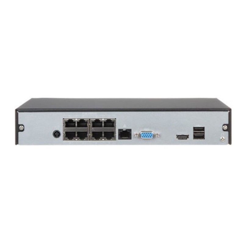 Мережевий реєстратор на 8 каналів, що має детекцію руху, PoE-порти для мережевих камер та високошвидкісний вхідний потік, USB-порт для резервного копіювання та слот на 8Тб основної пам'яті. Усі відео обробляються найновішими кодеками, що компресують вагу без втрати якості. Відеореєстратор підтримує роздільну здатність до 8 мегапікселів. Базується на Linux. Є передача аудіо та мультиекранний показ.