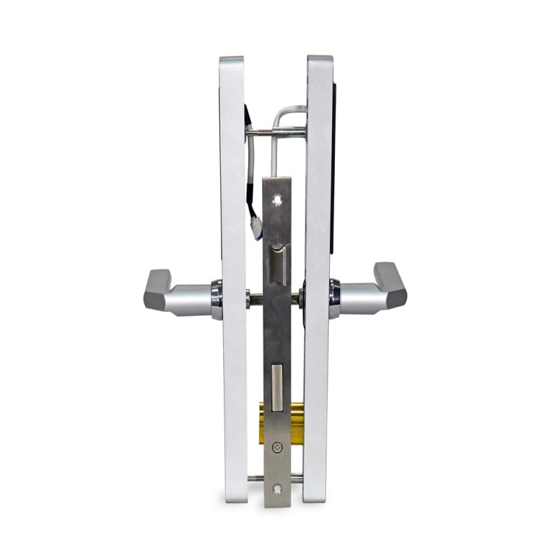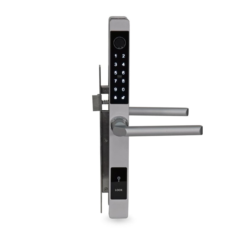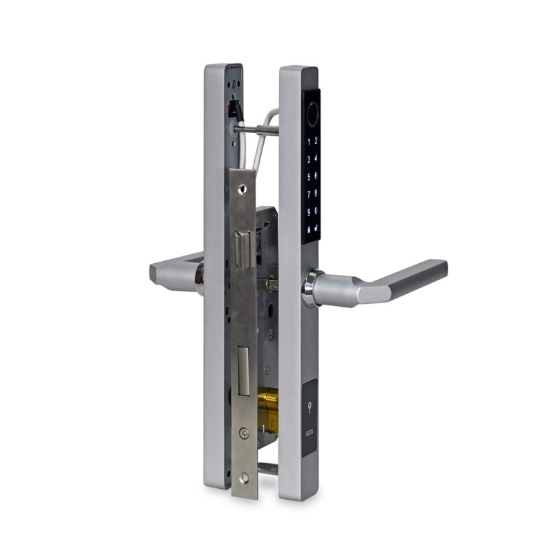 Біометричний автономний електрозамок з Bluetooth і зчитувачем відбитків пальців та карт Mifare 13.56 МГц; відімкнення за допомогою: відбитку пальця, коду, картки, застосунку, ключа; кількість користувачів за відбитком пальця / карткою / кодом: 200 / 200 / 150; роз'єм microUSB; застосунок для роботи TTLock, TTHotel; живлення 4*АА батарейки; тип, матеріал і товщина дверей: правобічні, металеві/дерев'яні, 35-90 мм; врізний монтаж; матеріал корпусу нержавіюча сталь; розміри 310 / 40 / 20 мм