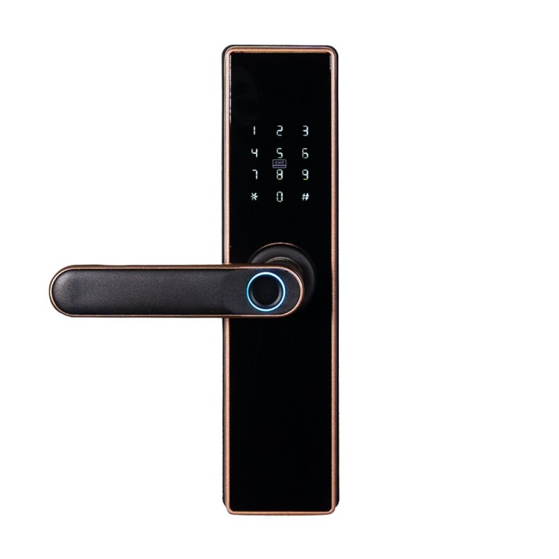 Біометричний автономний електрозамок з Bluetooth і зчитувачем відбитків пальців та карт Mifare 13.56 МГц; відімкнення за допомогою: відбитку пальця, коду, картки, застосунку, ключа; застосунок для роботи TTLock та TTHotel; кількість користувачів за відбитком пальця / карткою / паролем: 100 / 100 / 200; живлення 4*АА літієві батарейки, робота від батарейок 10-12 місяців; інтерфейс microUSB для заряджання; підходить для дверей товщиною 35-55 мм; 2 механічні ключі; матеріал корпусу алюмінієвий сплав; розміри 250 / 64 / 24 мм, серцевина 22-160 5050