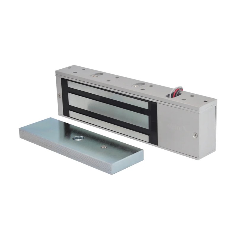 Електромагнітний замок з силою утримання до 500 кг; таймер затримки 0-30 сек; живлення 12/24 В; споживання струму 750 мА; світлова індикація; накладний монтаж; розміри 265 / 70 / 40 мм