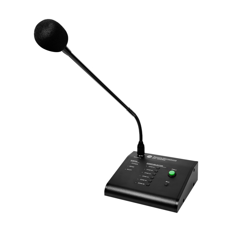 Виносний пейджинговий мікрофон; 6 зон; працює виключно з серією підсилювачів DA-500MT; можливість підключення до 6 мікрофонів у систему; робоча частота 80 Гц-16 кГц; співвідношення сигнал/шум >70 дБ; світлодіодна індикація роботи; живлення 24 В від підсилювача; споживання 3 Вт; розміри 172 / 150 / 50 мм; вага 0.9 кг