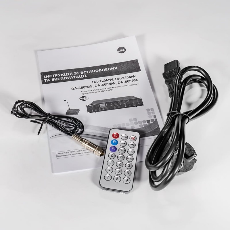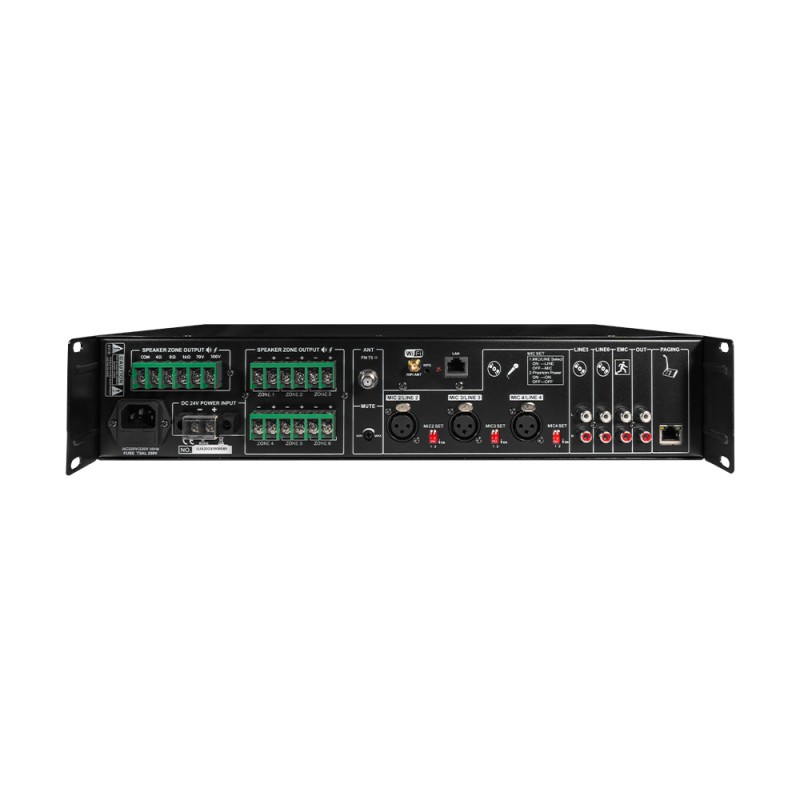 6-зонний мікшуючий підсилювач з WiFi; вихідна потужність 240 Вт; 6 зонних виходів на гучномовці 100 В / 1 зона 100 В/70 В/4-16 Ом; віддалене керування зі смартфона Android/iOS через мобільний застосунок; вбудований MP3-медіаплеєр з USB/SD, FM-тюнер, Bluetooth; входи: Mic1 6.3mm jack, мікрофонний/лінійний 2-4 балансні XLR, лінійні 1-2 RCA, EMC RCA, RJ45 для віддаленого пейджингового мікрофона; налаштування гучності, басів/високих частот; світлодіодні індикатори; живлення AC 230 В/ DC 24 В; монтаж у стійку 19” 2U; розміри 484 / 405 / 88 мм; вага 9.4 кг