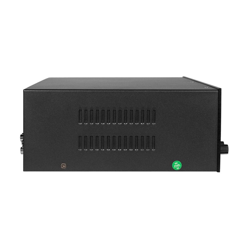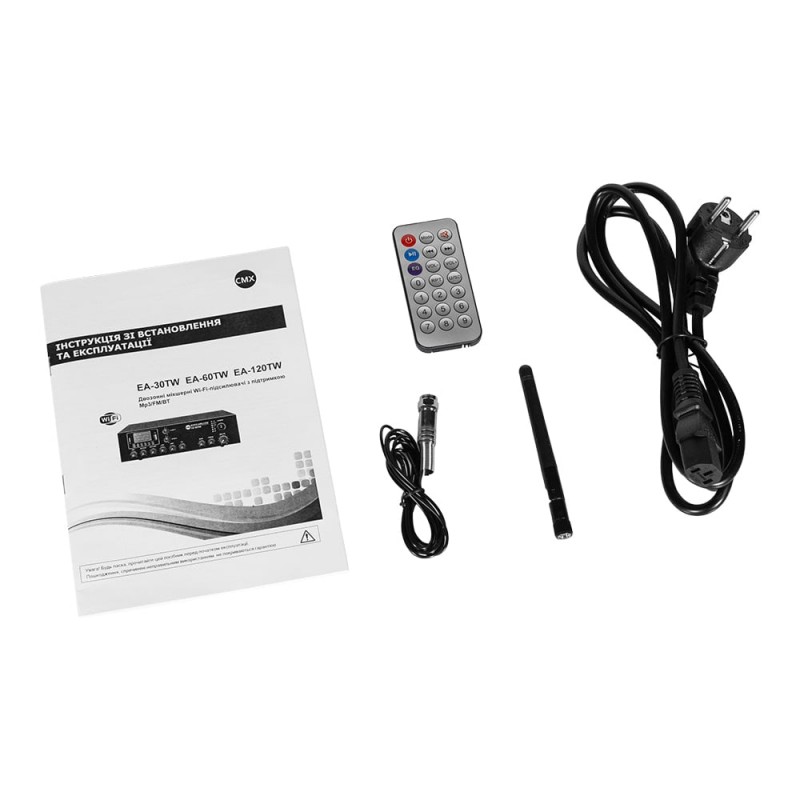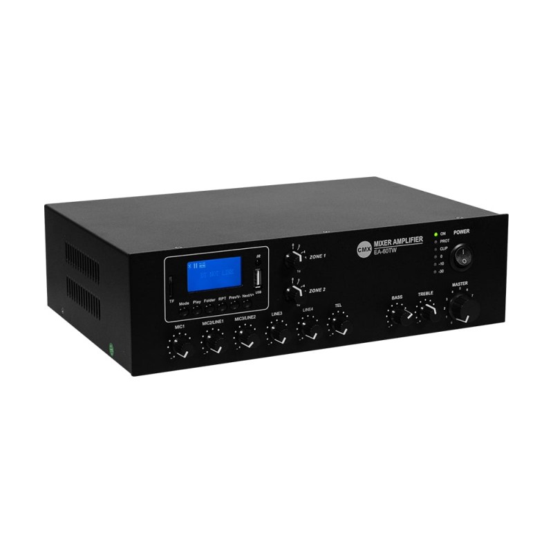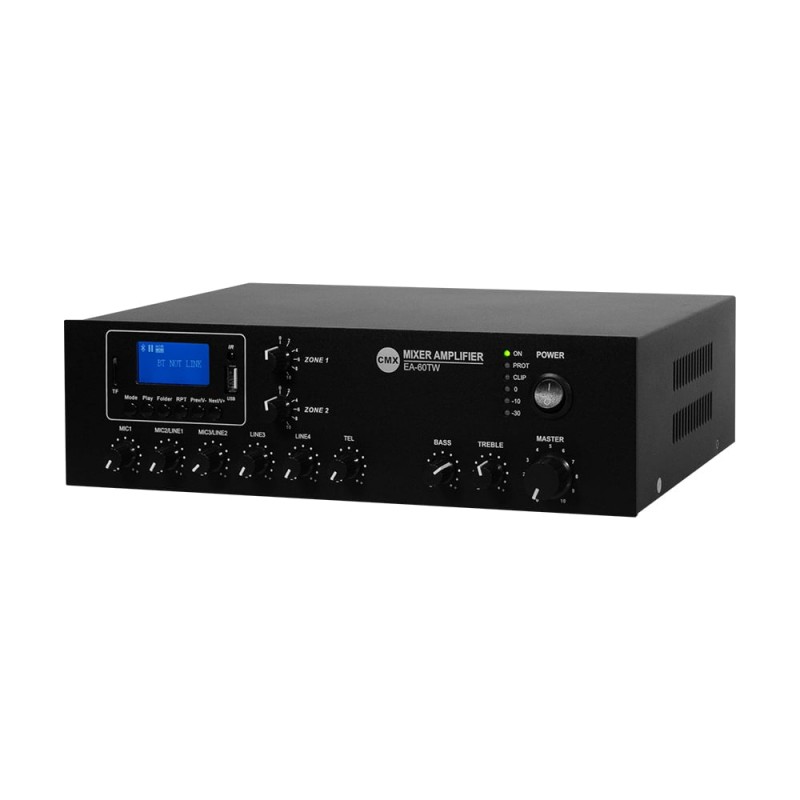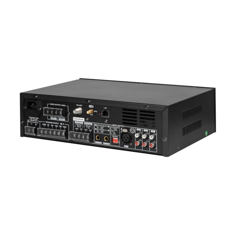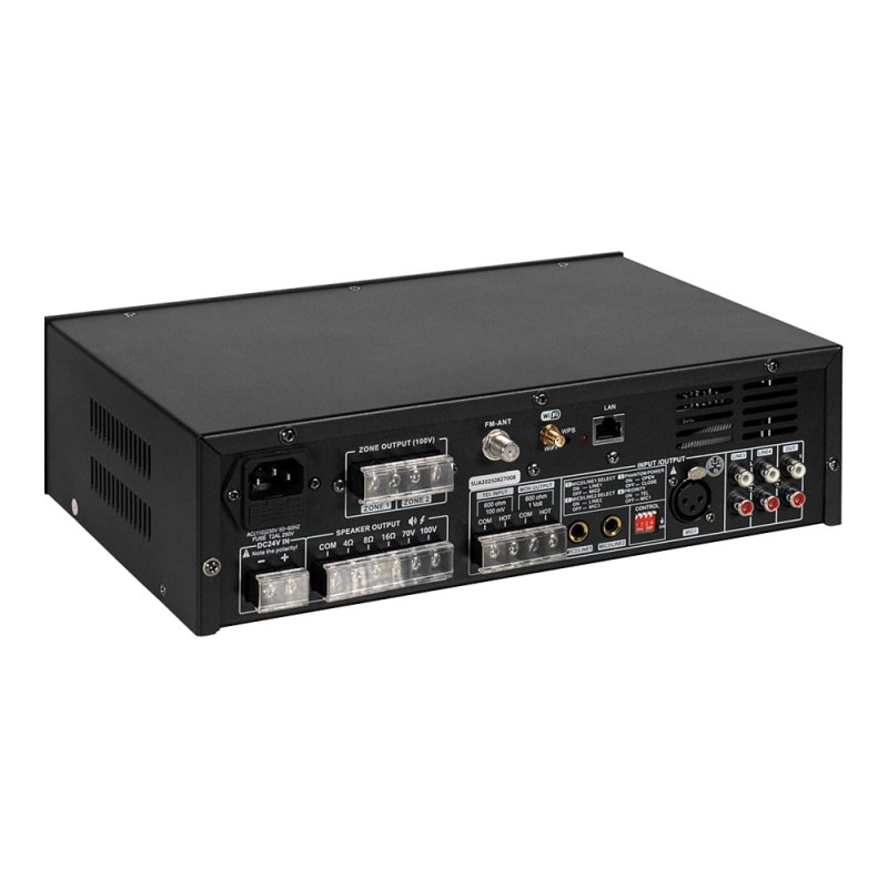 Настільний мікшуючий підсилювач з WiFi двозонний; вихідна потужність 60 Вт; 2 виходи на гучномовці 70 В/100 В та 4-16 Ом; віддалене керування зі смартфона Android/iOS через мобільний застосунок; вбудований MP3-медіаплеєр з USB/SD, FM-тюнер, Bluetooth; інтерфейси: вхід Mic1 з балансним XLR з фантомним живленням і найвищим пріоритетом VOX, входи мікрофон/лінія 2-3 з перемикачем з небалансним 6.3mm jack, телефонний вхід з вторинним пріоритетом і MOH (Music on Hold), лінійні входи 1-2 RCA, лінійний вихід RCA; налаштування гучності, басів/високих частот; світлодіодні індикатори; живлення AC 230 В / DC 24 В; розміри 320 / 210 / 90 мм; вага 3.95 кг