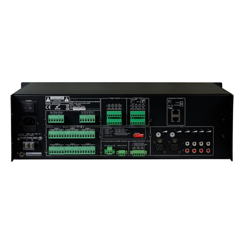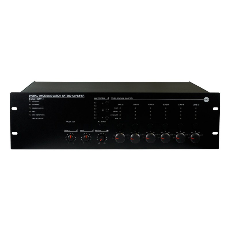 Розширювач зон 6-зонний (12 ліній), вбудований 500 Вт підсилювач класу D, розширення до 120 зон, мікрофон пожежний 5 мВ, 600 Ом; входи ліній 1-2 385 мВ, 10 кОм; збалансований Combo XLR; входи ліній 3-6 350 мВ, 10 кОм, RCA; частотна характеристика 80-20000 Гц; THD <1% при номінальній напрузі, 1 кГц; співвідношення S/N 70 дБ; вихід динаміка 100 В AB 6-ти зонний вихід на динамік; вихід REC 200 мВ; 8 входів керування: Max 3.3 В (режим напруги) або 0 В при замкненому контакті; монтаж у стійку 19"; розміри 484 / 132 / 449 мм; вага 23 кг