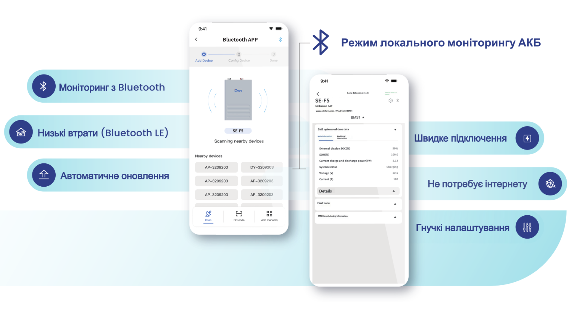 Deye SE-F5 Pro-C — это современный модульный аккумулятор на основе безопасной химии LiFePO₄, разработанный для бытовых и коммерческих систем накопления энергии. Он специально создан для интеграции с низковольтными инверторами Deye, а также с Victron, LuxPower, Voltronic, Growatt и другими совместимыми устройствами через интерфейсы CAN 2.0 / RS-485, а также через Wi-Fi / Bluetooth-приложение для удалённого мониторинга. Используются в основном в системах солнечных электростанций и источниках бесперебойного питания.