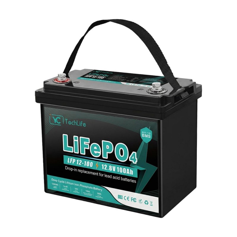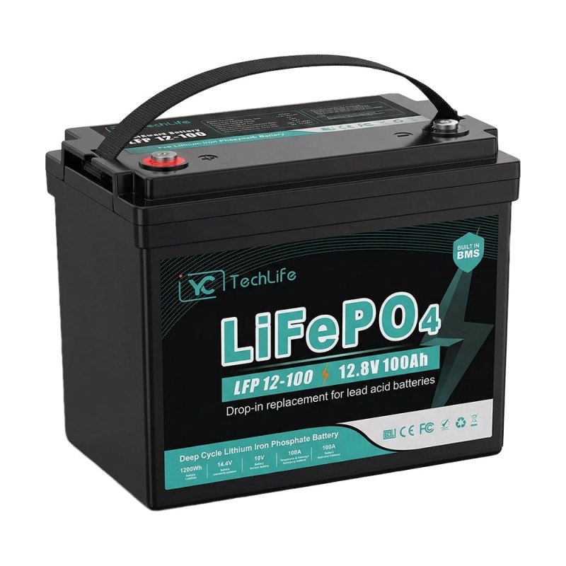Акумуляторна батарея літій-залізо-фосфатна (LiFePO4); ємність 100 А·год; номінальна вихідна напруга 12.8 В; макс. струм заряду 100 А (рекомендований 50 А) / розряду 100 А; кількість циклів: > 6000; тип клем M8; можливе послідовне підключення до 4 батарей та паралельне до 4 батарей; клас захисту IP55; розміри 328 / 172 / 220 мм; вага 11.5 кг