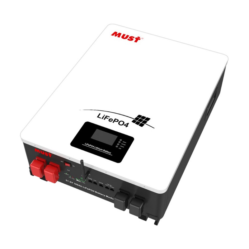Настінна літій-залізо-фосфатна акумуляторна батарея для системи накопичення енергії; напруга 51.2 В; ємність 100 Аг, потужність 5120 Втг; максимальний струм заряду/розряду 100 А/100 А; ресурс: 6000 циклів заряджання-розряджання; комунікаційні порти CAN, RS485, RS232, WiFi; клас захисту IP21; в одну систему можна підключити до 15 акумуляторних модулів; розміри 625.5 / 442 / 177 мм; вага 45 кг