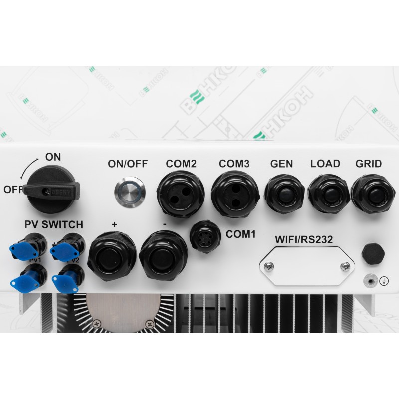 Данная модель имеет возможность подключения двух солнечных полей с током до 11А. Диапазон работы контроллера MPPT составляет 125-425В, стартует инвертор на 150В, а верхний предел напряжения поля 500В. В идеальном для инвертора случае солнечные панели следует подбирать из расчета номинального напряжения МРРТ 370В. В паспорте указана максимальная мощность суммарно 6500Вт, но по электрическим параметрам МРРТ может быть и больше, на современных панелях до 3500Вт на один МРРТ.