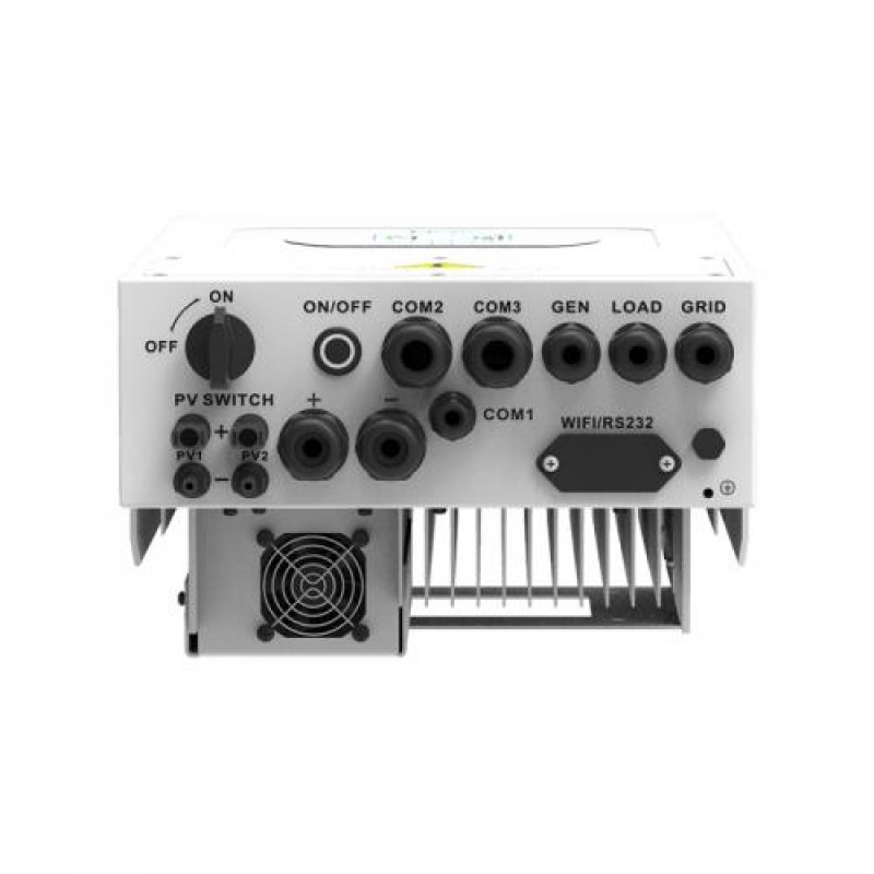 Инвертор имеет ЖК дисплей с сенсорным управлением, через дисплей проводятся все настройки, управление, установка конфигурации. Также в комплекте поставки WiFi модуль. Мониторинг позволяет следить за работой системы, просматривать графики за все время эксплуатации и практически по всем электрическим параметрам инвертора. Также статистика генерации, выработанной солнцем, отданной потребителю и в сеть доступна на базовом ЖК дисплее.