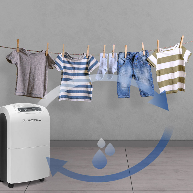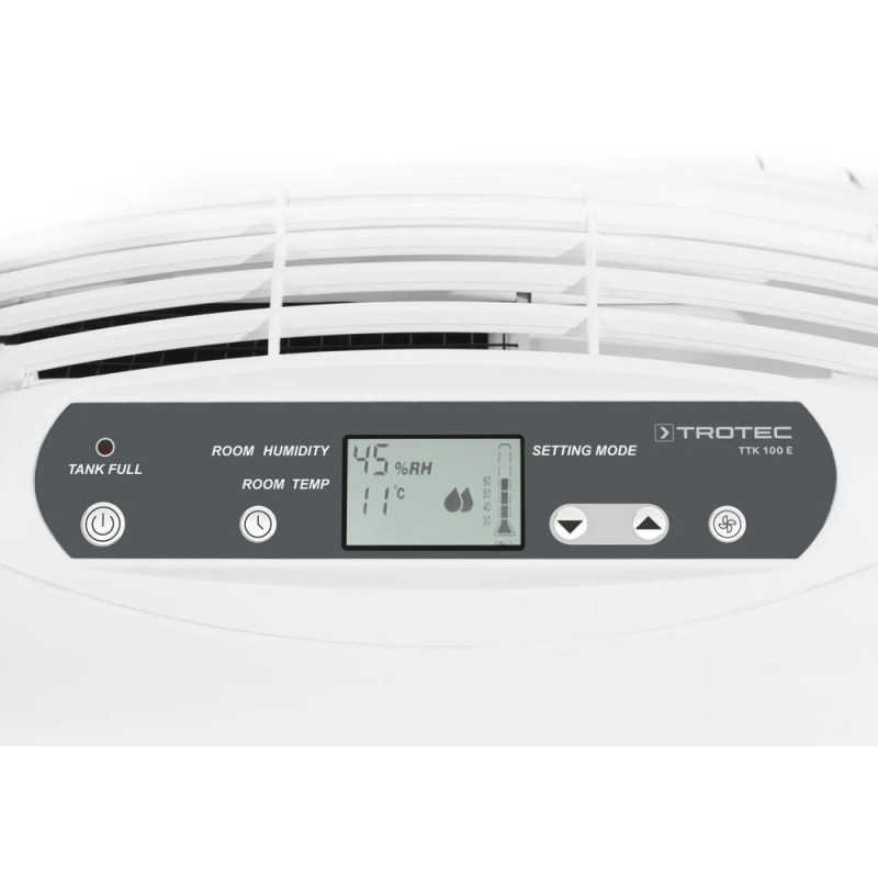 TTK 100 E имеет контролируемый гигростат осушки с предварительным выбором влажности. Предпочтительное значение влажности можно выбрать с целевым значением от 30 до 80% влажности с шагом 10%. Для достижения оптимального комфортного климата целевое значение должно быть установлено между 50 и 60 %. Как только достигается требуемый уровень влажности, компрессор выключается. Вентилятор проходит насквозь. Если предел превышен, устройство автоматически активируется.