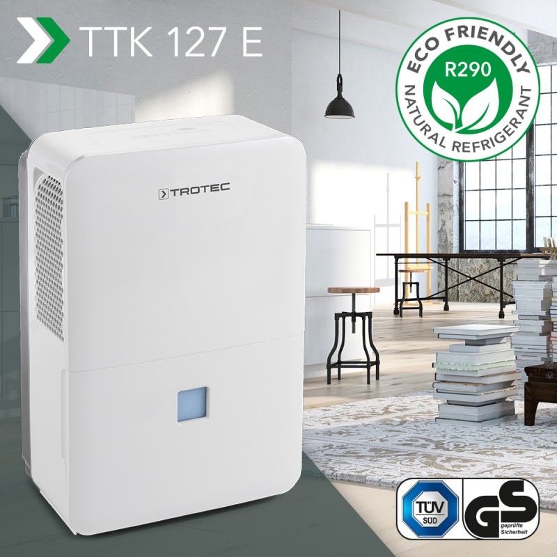 Интегрированный отдельный штуцер для шланга позволяет наружный отвод конденсата даже в непрерывном режиме без присмотра – идеальное условие для постоянного использования, например, в мастерских или отпускных апартаментах, где невозможно регулярно опорожнять резервуар. Большой конденсатный резервуар имеет объем 6 литров, что значительно уменьшает интервалы опорожнения. Благодаря колесам и удобным ручкам TTK 127 E также идеально подготовлен для гибкой смены места использования. Управление TTK 127 E благодаря комфортным функциям столь же просто, сколь и легко в обслуживании.