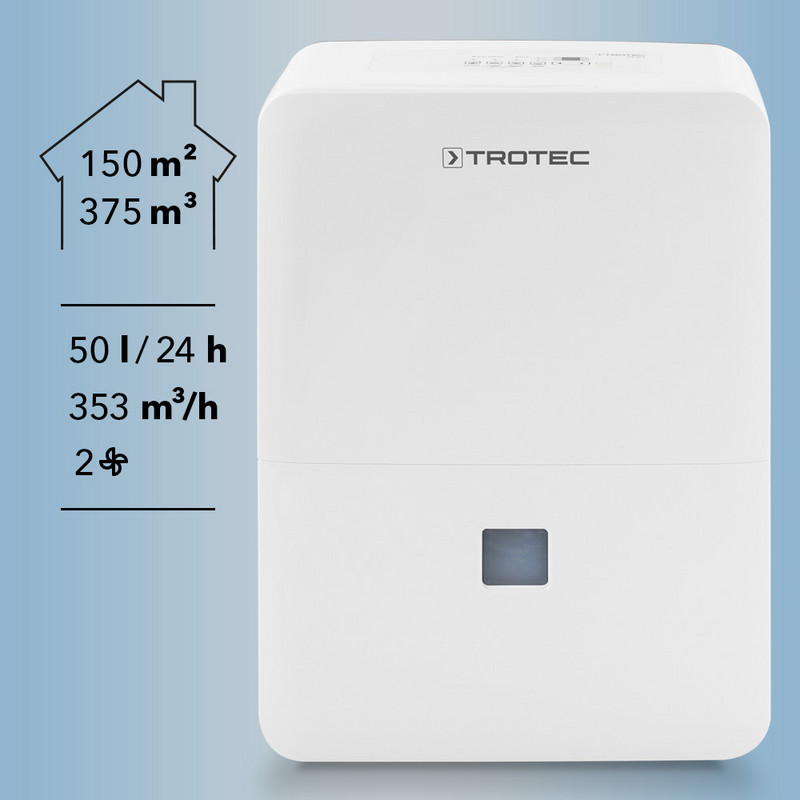 Благодаря качественному встроенному конденсатному насосу и комфортной настройке функции откачки простым нажатием кнопки можно автоматически отводить 50 литров воды за 24 часа в больших помещениях объемом до 375 м³. Благодаря этой мощности насос можно легко преодолеть максимальную высоту до 4 метров, например, до следующего этажа. Кроме того, есть возможность осушать помещение с высокой влажностью в непрерывном режиме, без необходимости постоянно опорожнять резервуар для воды. Особенно это полезно там, где нужно удалить большое количество влаги из воздуха, например после затопления.