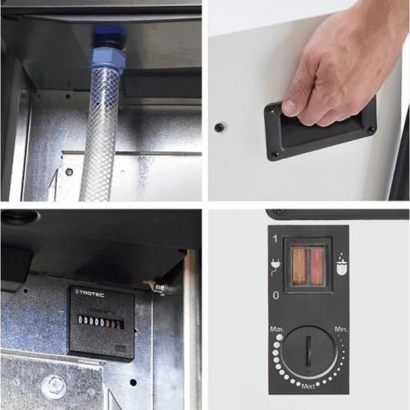 Устройство идеально работает при устранении повреждений, вызванных водой при затоплении, или на стройплощадке. TTK 350 S от Trotec с мощностью осушения 70 л в день обладает необходимой производительностью, чтобы после наводнения за короткое время быстро высушить пораженные водой участки и предупредить появление плесени, помочь при сушке штукатурки, чтобы сократить сроки строительных работ. На больших складах коммерческий осушитель также обеспечивает оптимальный микроклимат в помещении благодаря автоматической работе, управляемой гигростатом. Встроенный гигростат и счетчик работы позволяют контролировать все: микроклимат, уровень влажности, температуру, потребление электричества, производительность. После первого же практического использования этой модели оказывается, что долговечное качество и надежность работы очень быстро окупаются.
