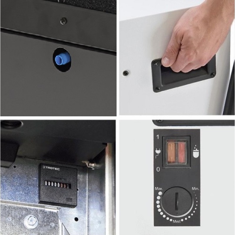 Trotec TTK 650 S – промышленный осушитель воздуха, рассчитанный на поддержание требуемого процента влажности в помещениях квадратурой до 590 м2 и объемом до 1470 м³. Работает по принципу кондиционера, используя экологически чистый тип фреона R454C. Это устройство покорит вас своей функциональностью, ведь оно способно справиться со следующими задачами: убрать чрезмерную влагу из воздуха; уменьшить риск возникновения плесени; быстро осушить помещение после сильных дождей или потопа. Осушитель воздуха работает надежно и эффективно. В сутки он способен удалить до 100 литров влаги, при этом его потребление электроэнергии всего 2.1 кВт.