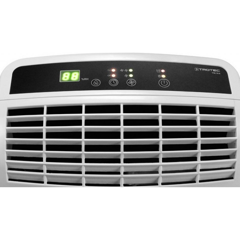 Trotec ТТК 75 E совершенно прост в управлении. Для него предусмотрены наиболее оптимальные режимы работы с настройкой требуемого уровня влажности, с выбором одной из двух скоростей вентилятора и возможностью настройки работы по таймеру. Панель управления с несколькими сенсорными кнопками и сегментным индикатором дисплея позволяет легко выбрать нужный режим: