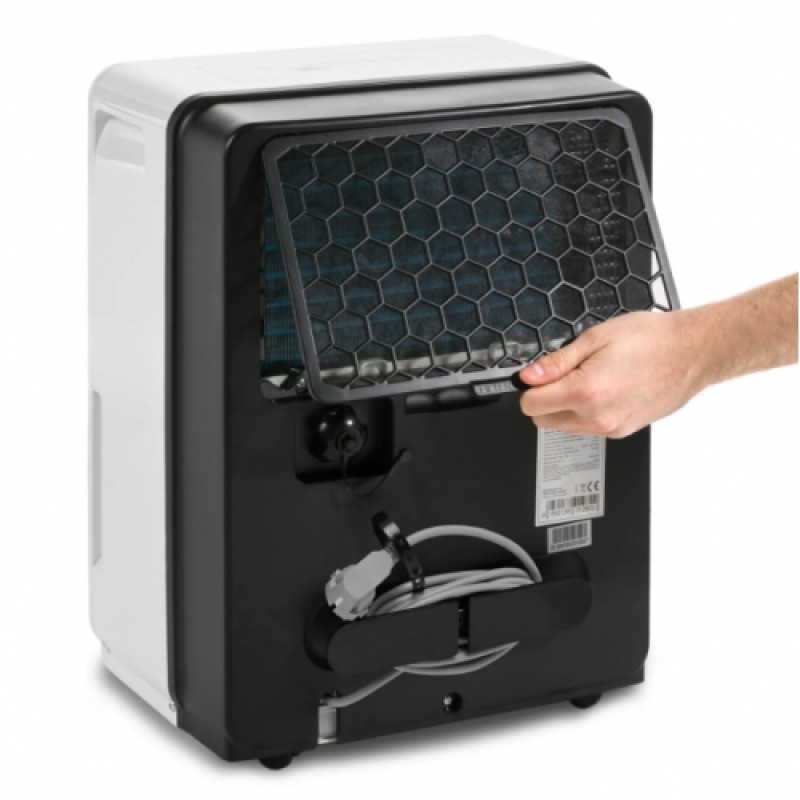 Легко съемный воздушный фильтр задерживает пух и шерсть животных, его можно быстро и легко вытереть или вымыть. Съемный резервуар для воды имеет емкость 3 л. Устройство автоматически останавливается, когда бак заполнен, и сигнализирует об этом через светодиод. К задней части устройства можно подключить шланг, чтобы обеспечить непрерывный сток конденсированной воды.