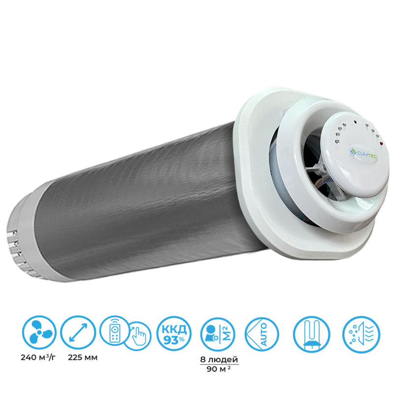 Разделение потоков воздуха и большой алюминиевый теплообменник обеспечивает стабильно высокий возврат тепла независимо от продолжительности работы устройства. Данная модель сохраняет 89% температуры внутри помещения. То есть, если за окном -10°С, а в здании +22°С, то температура входящего воздуха будет около 18°С при выключенном ТЭНе. Это несравнимо теплее, чем открывать окно и проветривать в мороз.