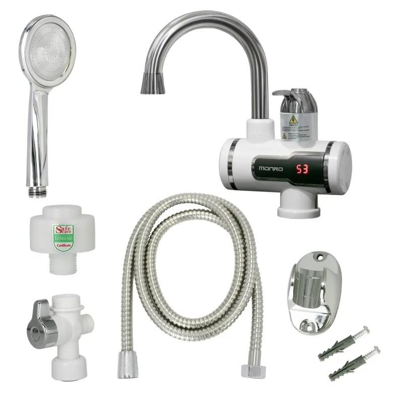 Технічні характеристики: Напруга: 220 В/50 Гц Потужність: 3 кВт Тиск: 0.4-3.0 бар Вилив: латунь. Матеріал АБС пластик Висота виливу 23см, довжина виливу 15см Продуктивність: 3.8 л/хв за температури 40град. Довжина шнура 100 см Нагрів води - 5 сек 35-60град. Підключення до холодної води, різьблення 1/2 Гарантія 12 міс.