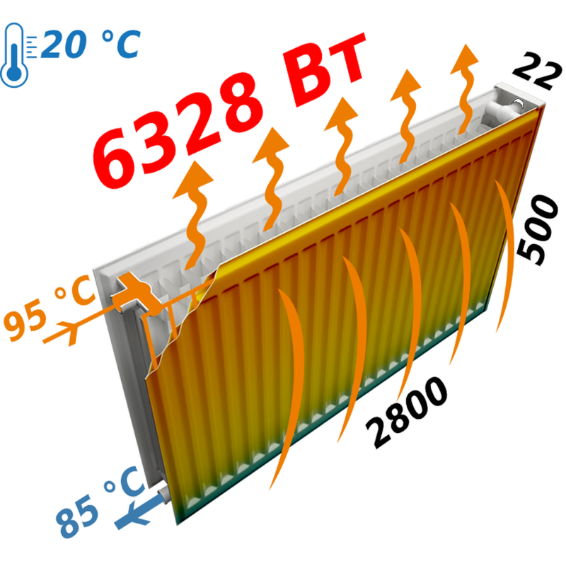 Характекристики: • Тип - 22 (дві панелі з двома конвекторами) • Висота – 500 мм • Довжина – 2800 мм • Підключення - бокове • Міжосьова відстань бічного підключення – 445 мм • Теплова Потужність ∆t=70/60/50°C, Вт - 6328/5062/4050 • Вага, кг - 71,12 • Обсяг води, л - 14,7 • Опалювана площа h=2,7м (t=20°C), м2 - 38-47 • Максимальний робочий тиск 10 бар • Максимальна температура: 120 °С • Товщина листа панелі: 1,11+0,09 мм • Товщина листа конвектора: 0,3+0,09 мм • Товщина листа бокової і верхньої кришки: 0,5+0,09 мм • Колір: білий (RAL9016)