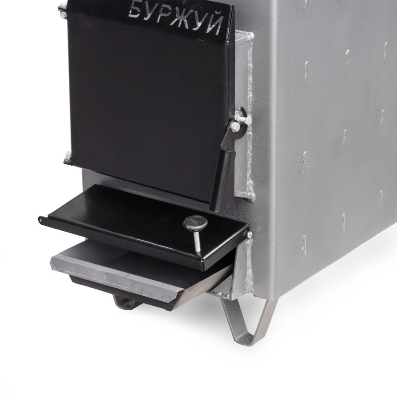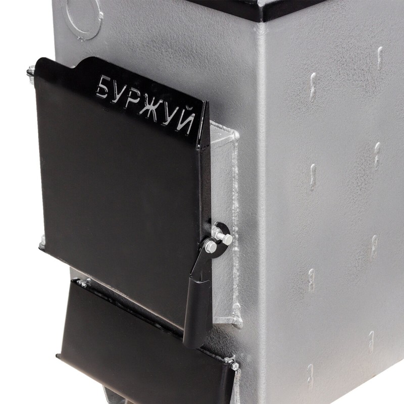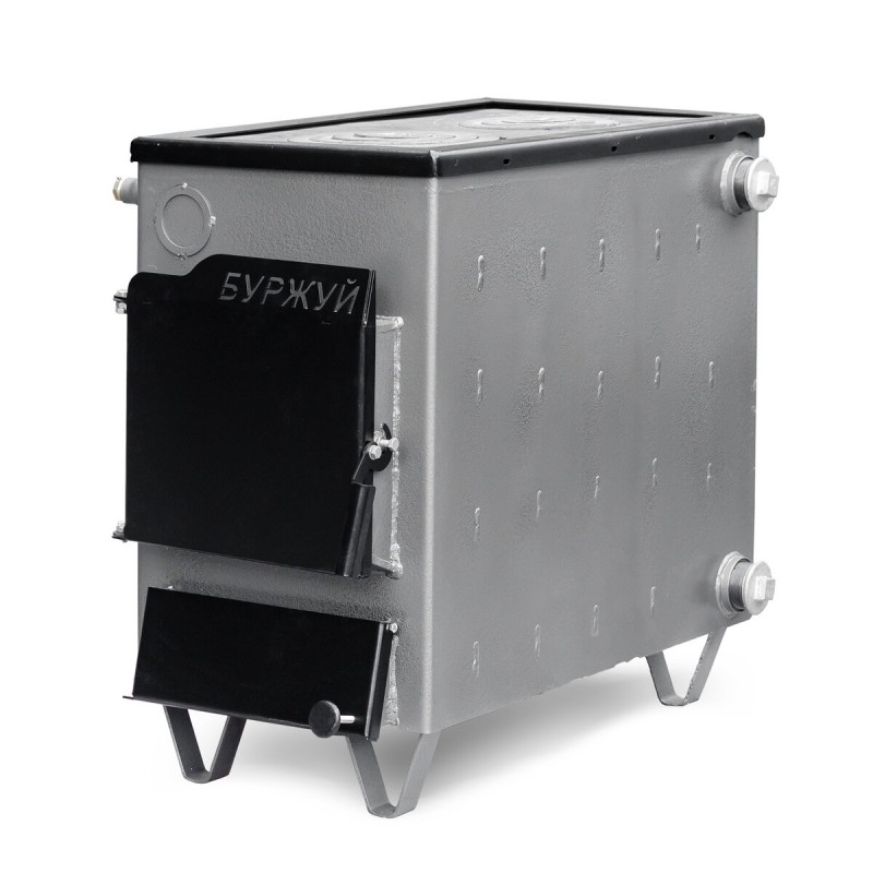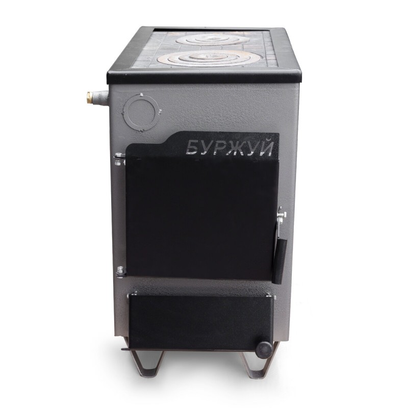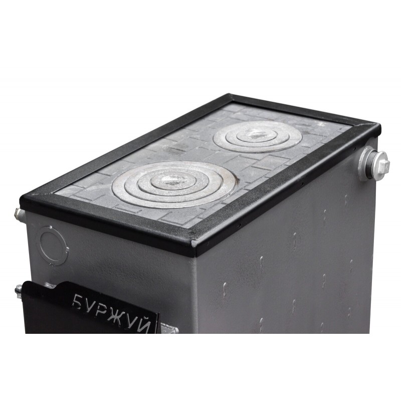 Буржуй КП-18 кВт твердопаливний котел з плитою, з виходом димоходу назад, виготовлений з високоякісної сталі товщиною 4 мм. Працює на всіх видах твердого палива: дрова, вугілля, тирса, брикети, обрізки гілок.Переваги: Тривалість горіння палива на одному завантаженні до 8 годин (в залежності від спалюваного виду палива). Чавунні колосники запорука довгої служби котла. Котел можна використовувати як плиту в котел вбудована чавунна плита з конфорками для приготування їжі. На плиті є кілька кілець під посуд різного розміру. Універсальність підключення котел має чотири патрубки для установки в систему опалення, що дозволяє підключити його як з лівого, так і з правого боку. Незадіяні виходи закриваються заглушками, які йдуть в комплекті. У комплекті: круглий вихід димоходу 150 мм або 170 мм, або прямокутний розміром 100х200 мм. У верхній і нижній частинах камери згорання встановлені два наповнених водою теплообмінника, дно також обладнано водяною сорочкою. При нагріванні досягається оптимальне співвідношення потужності котла до об'єму води в ньому. Це дозволяє отримати максимум тепла від палаючого палива і запобігає закипанню води, збільшуючи термін служби виробу. Теплообмінники виконані з цілісного листа сталі, без додаткових зварних швів. Можливість установки електричного ТЕНу до котла можна підключити електричний ТЕН і автоматику. ТЕН підтримує безперервну роботу котла в разі відсутності твердого палива, дозволяє утримувати температуру води в системі на рівні 5-10 С. Котел також працює як батарея котел може віддавати тепло від поверхні стінок.