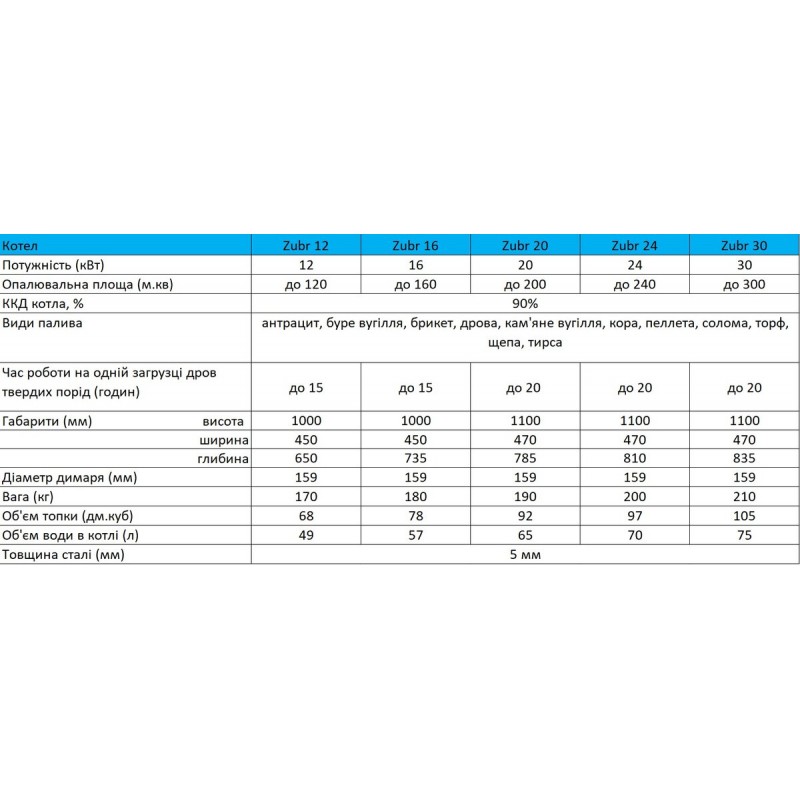Твердопаливні котли тривалого горіння Zubr Standart 16 кВт для опалення приміщень площею до 160 м2. Котел може спалювати такі види твердого палива: дрова, вугілля, всі види брикетів, і як складова до основного палива тріска, тирса та всілякі відходи деревообробки.