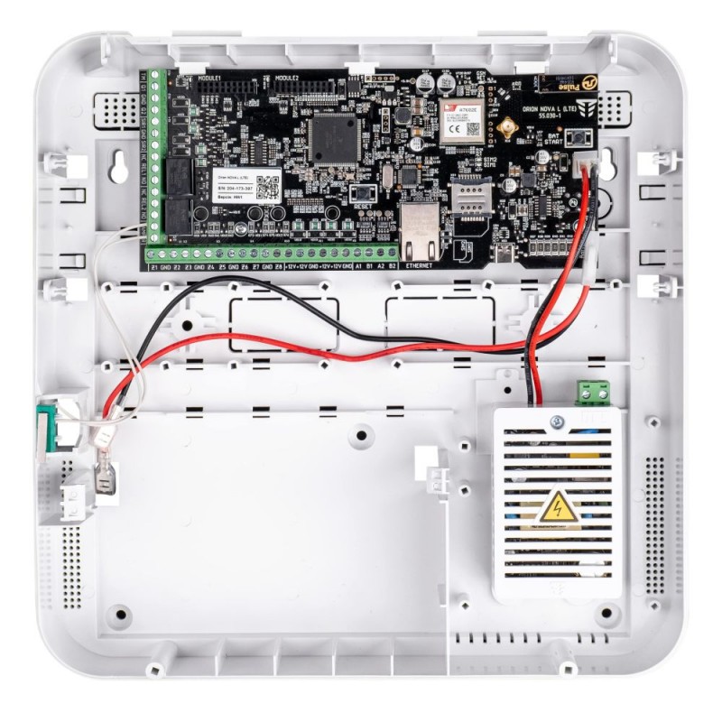 Дротова централь охоронної системи Orion NOVA на 8 дротових охоронних зон з можливістю розширення до 250 дротових зон або бездротових пристроїв; 128 користувачів, 128 груп, 64 сценарії, до 12 клавіатур, до 15 виносних пристроїв розширення, 6 виходів; канали зв’язку: 2x SIM-карти 2G/4G (LTE), Ethernet, додатково Wi-Fi за допомогою M-WiFi; макс. вихідний струм 1000 мА; живлення основне 220 В, резервне від LiFePO4 / свинцево-кислотної АКБ 7 Аг/9 Аг – купується окремо; вбудований блок живлення на 25 Вт; розміри 280 / 280 / 85 мм; вага 1.6 кг