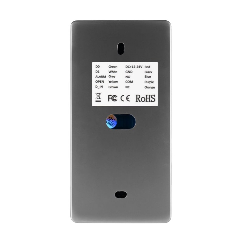 Автономна сенсорна клавіатура/контролер зі скануванням відбитку пальця та вбудованим зчитувачем карток і брелоків Mifare (13.56MHz); дальність зчитування карт 2-5 см; час відімкнення дверей 0-99 сек; вхід під інтерфейс Wiegand – можна підключити додатковий зчитувач; контроль доступу: за відбитком пальця, кодом, картою; пам’ять 10000 карт/кодів, 300 відбитків пальця; підсвічування клавіатури; живлення DC12-24В (30мА); металевий антивандальний корпус; ступінь захисту IP65; робоча температура від -40˚C до +60˚C; розміри 139 / 70 / 22 мм