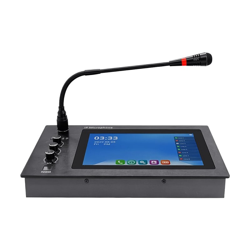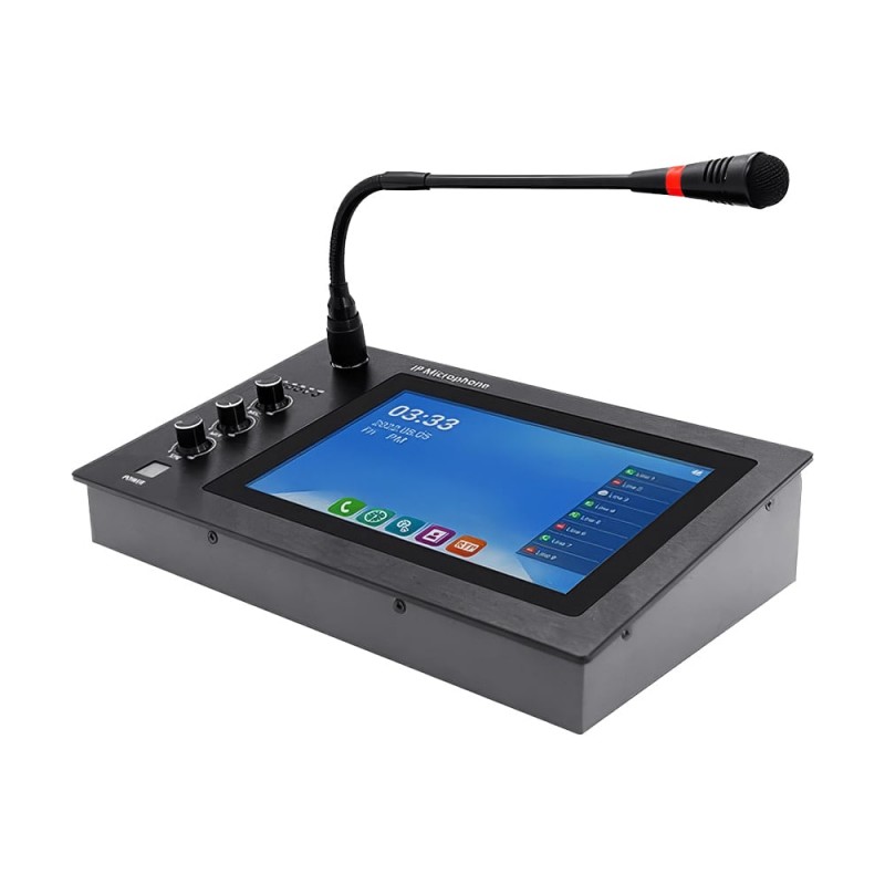SIP-IP пейджинговий мікрофон; 8 SIP-ліній; вбудований динамік 5 Вт та мікрофон; система Android 5.1, 8 ГБ флеш-пам'яті, WiFi 2.4 ГГц; 8-дюймовий сенсорний екран, роздільна здатність 1280x800; кодеки: OPUS 48 кГц, MP3 44.1 кГц, G.722 ADPCM 16 кГц, G.711 PCMU 8 кГц, G.711 PCMA 8 кГц; інтерфейси: 2 аудіовходи, 1 аудіовихід, 1 USB 2.0, 2 тривожні входи, 1 вихід; регулятори гучності: MIC (мікрофон), MIX (фоновий звук), SPK (динамік), OUT (аудіовихід); RTP multicast пейджинг; моніторинг у реальному часі; підтримка FTP-сервера, відтворення музики з USB-диска; 30 клавіш швидкого набору; живлення DC 12 В/2 А; споживана потужність до 24 Вт; робоча температура -10°C~+45°C; матеріал: лита алюмінієва панель + корпус з холоднокатаної сталі; розміри 284 / 170 / 60 мм; вага 1.8 кг