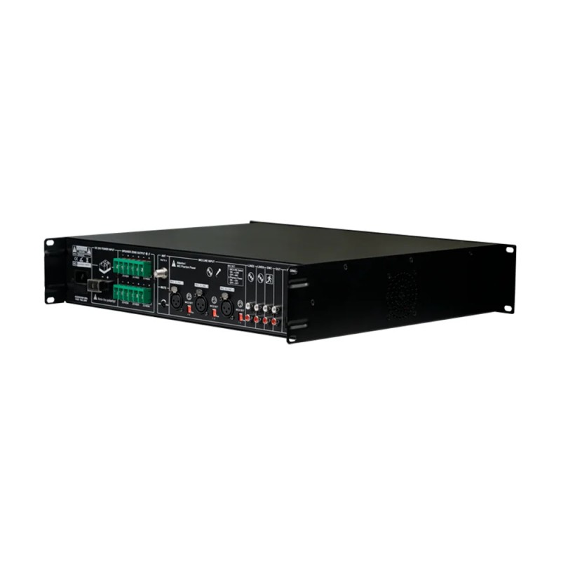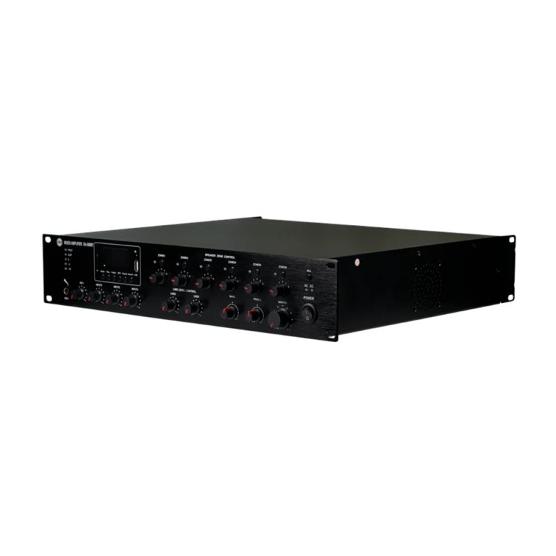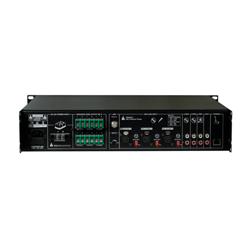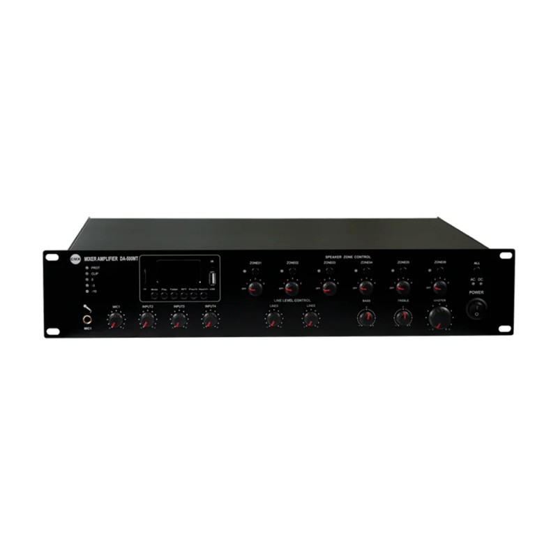 6-зонний 500 Вт мікшуючий підсилювач з Mp3 / FM, USB / SD; 4 мікрофонні входи, 3 Aux входи; вихід 70 В / 100 В / 4-16 Ом, з незалежним регулюванням гучності; 19-дюймовий, висотою 2U; розміри 484 / 405 / 88 мм; вага 10.4 кг