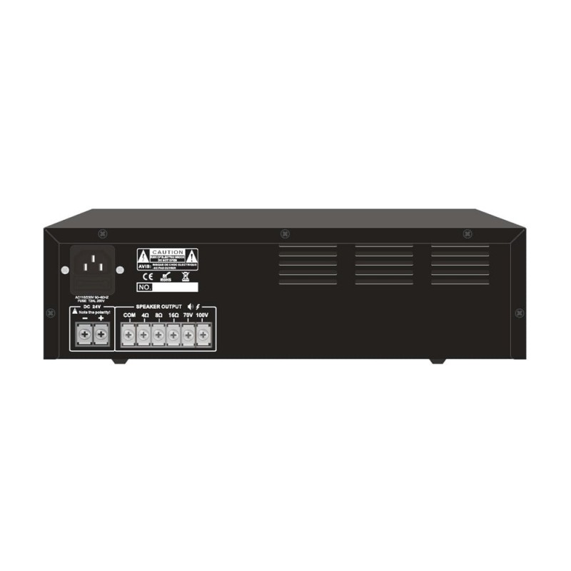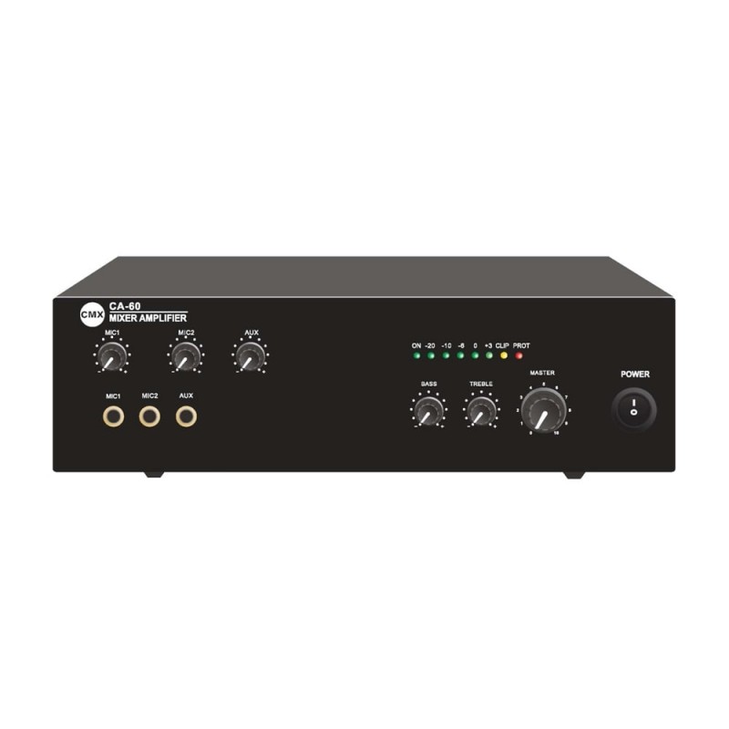 Настільний мікшуючий підсилювач однозонний; вихідна потужність 60 Вт; вбудований MP3-медіаплеєр з USB/SD, FM-тюнер, Bluetooth; вихід на гучномовець 100 В/70 В та 4-8-16 Ом; інтерфейси: вхід Mic1-2 з небалансним 6.3 мм роз’ємом (5-8 мВ, 600 Ом), вхід Aux з небалансним 6.3 мм роз’ємом (150-470 мВ, 10 кОм); частотний діапазон 60-15000 Гц; співвідношення сигнал/шум: до 85 дБ для лінійного входу, 72 дБ для мікрофона; регулювання низьких/високих частот, гучності; світлодіодні індикатори; живлення AC 230 В / DC 24 В; споживана потужність 100 Вт; розміри 320 / 210 / 90 мм; вага 4 кг
