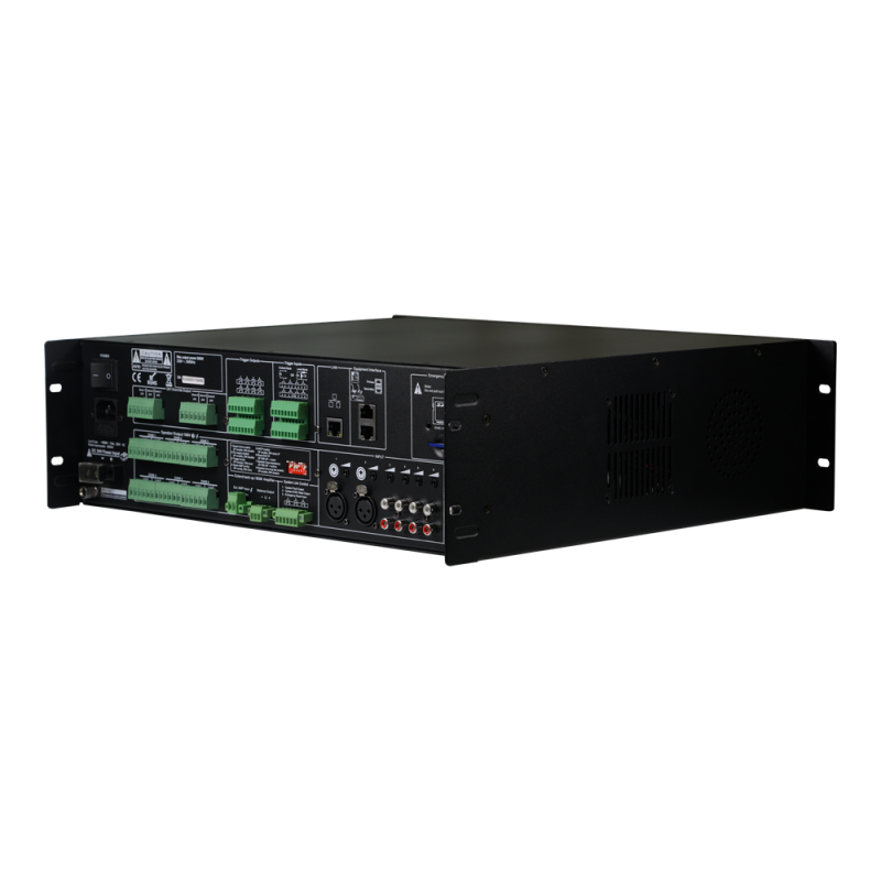 6-зонний підсилювач-контролер для системи оповіщення про пожежу; вихідна потужність 240 Вт: мікрофон пожежний 5 мВ, 600 Ом; входи ліній 1-2 385 мВ, 10 кОм збалансований Combo XLR; входи ліній 3-6 350 мВ, 10 кОм, RCA; частотна хар-ка 80-20000 Гц; 8 входів управління: Max 3.3 В (режим напруги) або 0 В при замкненому контакті; 8 входів управління: 0В при замкненому контакті; вбудований слот для SD-карти; монтаж у стійку 19"; розміри 484 / 132 / 449 мм; вага 21 кг