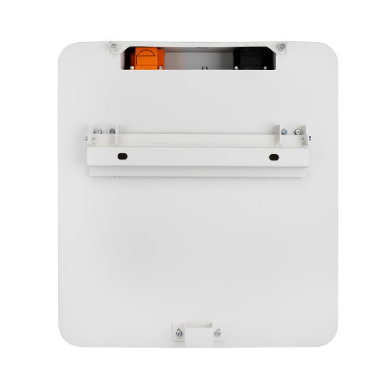 Корпус виконаний у компактному настінному форматі із закругленими краями, що дозволяє інтегрувати пристрій у житлові та технічні приміщення без перевантаження простору. Фронтальна панель відрізняється мінімальним дизайном із центральним круглим індикаторним модулем, що надає візуальну інформацію про стан заряду. Біла матова поверхня не притягує пил і добре поєднується із сучасними інтер'єрами. Конструкція передбачає зручний доступ до комунікаційних та силових роз'ємів, розташованих на бічній частині корпусу.