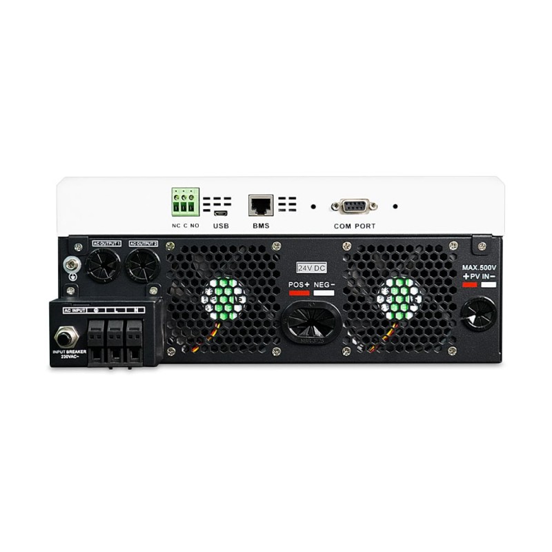 Гібридний однофазний інвертор; максимальна потужність 6.5 кВА/6.2 кВт, максимальна короткочасна потужність 12.4 кВА; правильна синусоїда на виході 220 В; вбудований MPPT-контролер та мережевий зарядний пристрій; максимальний струм заряду 120 А; вхідна напруга 90-280 В; діапазон напруги від сонячних панелей 60-450 В, макс. потужність 6000 Вт; ККД 93%; вихідна напруга 230 В ±5%; вихідна частота 50/60 Гц; напруга акумуляторної системи 48 В; час перемикання на АКБ 10 мс; підтримка заряду АКБ типу AGM/GEL/LiFePo4/Li-ion; вбудований локальний WiFi – лише для моніторингу з мобільного застосунку; LCD-дисплей; функція «холодного» пуску; режим підмішування; захист від перевантаження, короткого замикання, перегріву; робоча температура 0°C~+50°C; розміри 583 / 380 / 214 мм, вага 10.4 кг