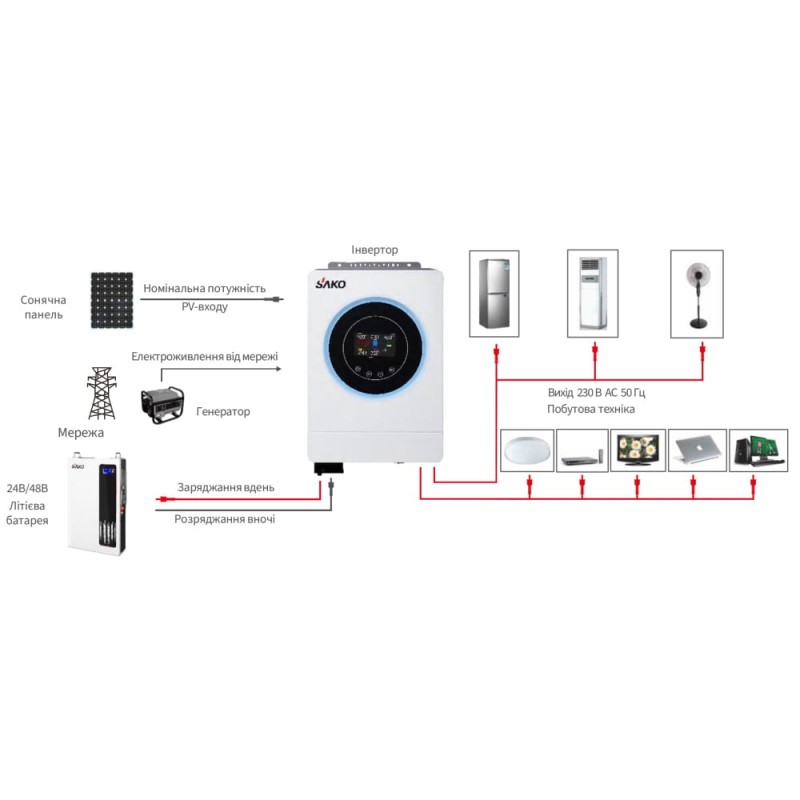 Гібридний інвертор 6.5kVA/6.2kW Sako SUNON V 6.5KVA/6200W/48V+120A MPPT