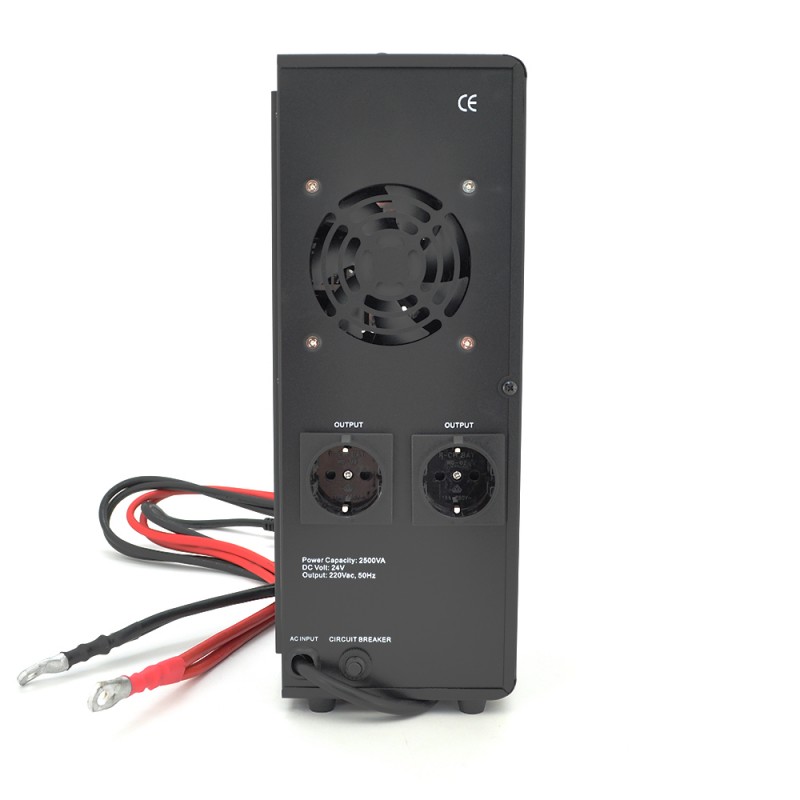 Основные характеристики Параметр Значение Мощность ~1800 Вт / 2500 ВА Напряжение питания аккумулятора 24 В Тип аккумулятора AGM / GEL / LiFePO₄ совместимы Струм заряда аккумулятора можно переключать: 5 А / 10 А / 15 А / 20 А / 30 А Выходной сигнал "чистая синусоида" Входное напряжение сети переменного тока ~145-275 В AC (диапазон, в котором устройство нормально работает) Выходное напряжение при работе от АКБ 220 В AC ±5% Частота 50/60 Гц Время переключения на питание от батареи ≤ 6 мс Защиты защита от короткого замыкания, от перегрузки, от полного разряда батареи; “cold start” функция (запуск от АКБ без сети) Рекомендуемая ёмкость АКБ от ~100 до 200 А·ч (зависит от нагрузки, времени резервного питания) Габариты 390 × 245 × 275 мм