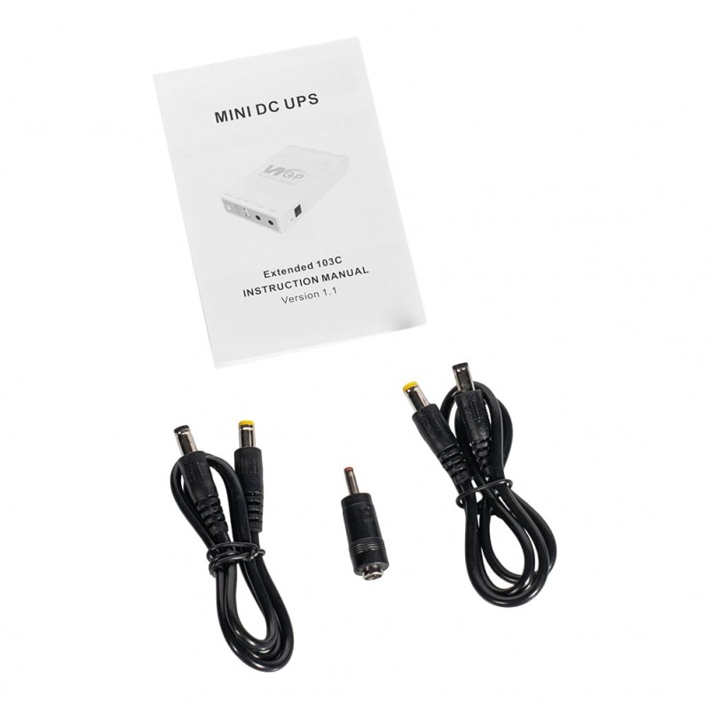 Комплект з мініДБЖ для роутера/ONU-термінала та блоку живлення. Джерело безперебійного живлення з 4 вбудованими акумуляторними батареями Li-ion ємністю 5000 мА·год (загальна ємність 20000 мА·год); максимальна загальна вихідна потужність 25 Вт; вихідні інтерфейси USB, DC *2, вихідна напруга 5 В + 12 В + 12 В; вихідна напруга/струм та максимальна потужність кожного виходу: USB: 5В/1А, DC1: 12В/1А, DC2: 12В/1А; вхідна напруга DC 12В/2А; роз’єм DC вхідний 5.5 / 2.1 мм, роз’єм DC вихідний 5.5 / 2.5 мм; розміри 132 / 79 / 28.5 мм, вага 380 г; у комплекті 2 кабелі DC-DC 5*2.5 довжиною 51 см кожен і роз'єм DC. Імпульсний блок живлення; номінальна вихідна напруга 12 В, вихідний струм 2 А, вихідна потужність 24 Вт; вхідна напруга 100-240 В; корпус ABS-пластик; роз’єм DC 5.5 / 2.5 мм; довжина шнура 90 см